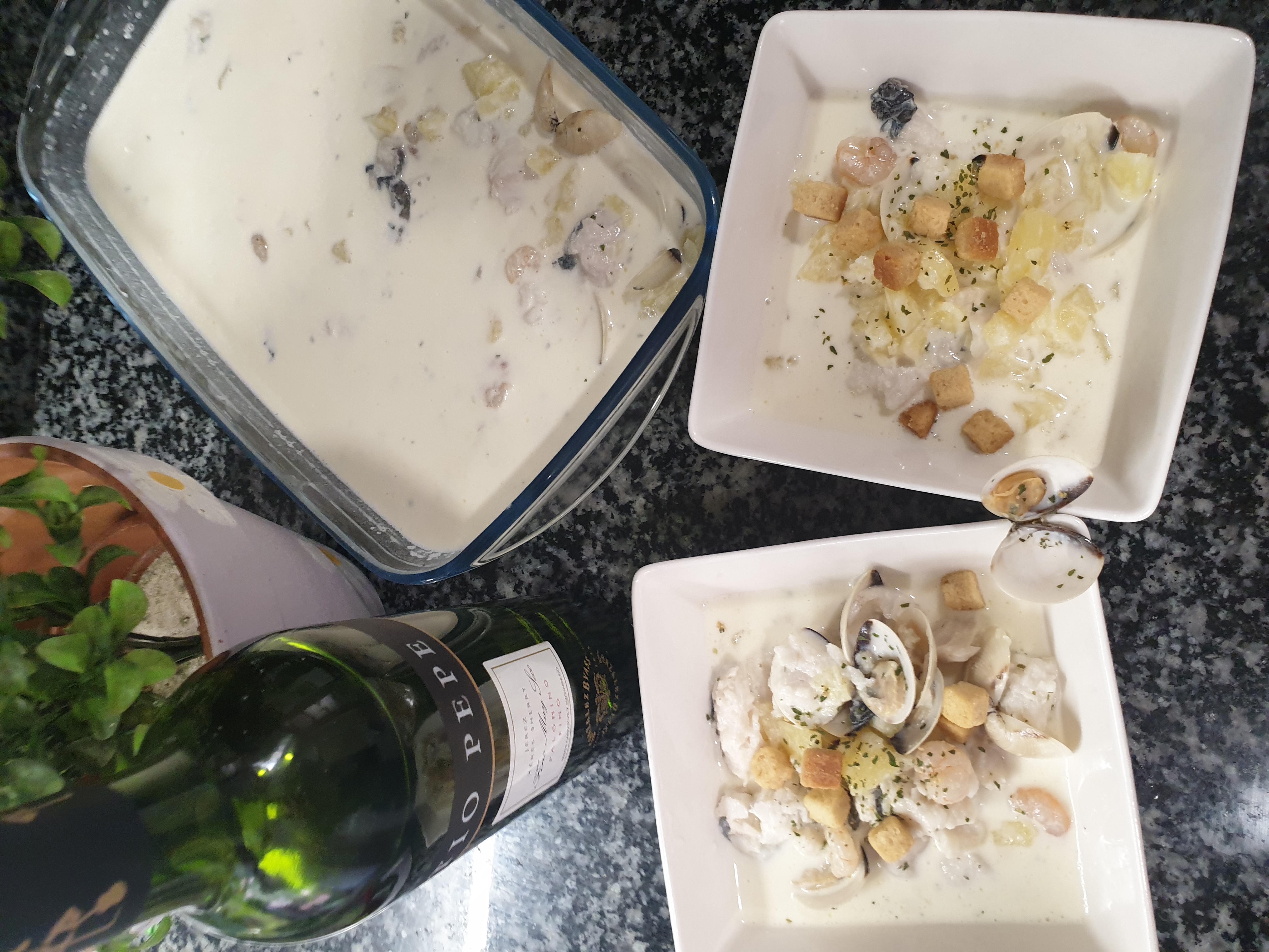 o bien 250 g de chirlas frescas limpias - 150 g de gambas crudas peladas
