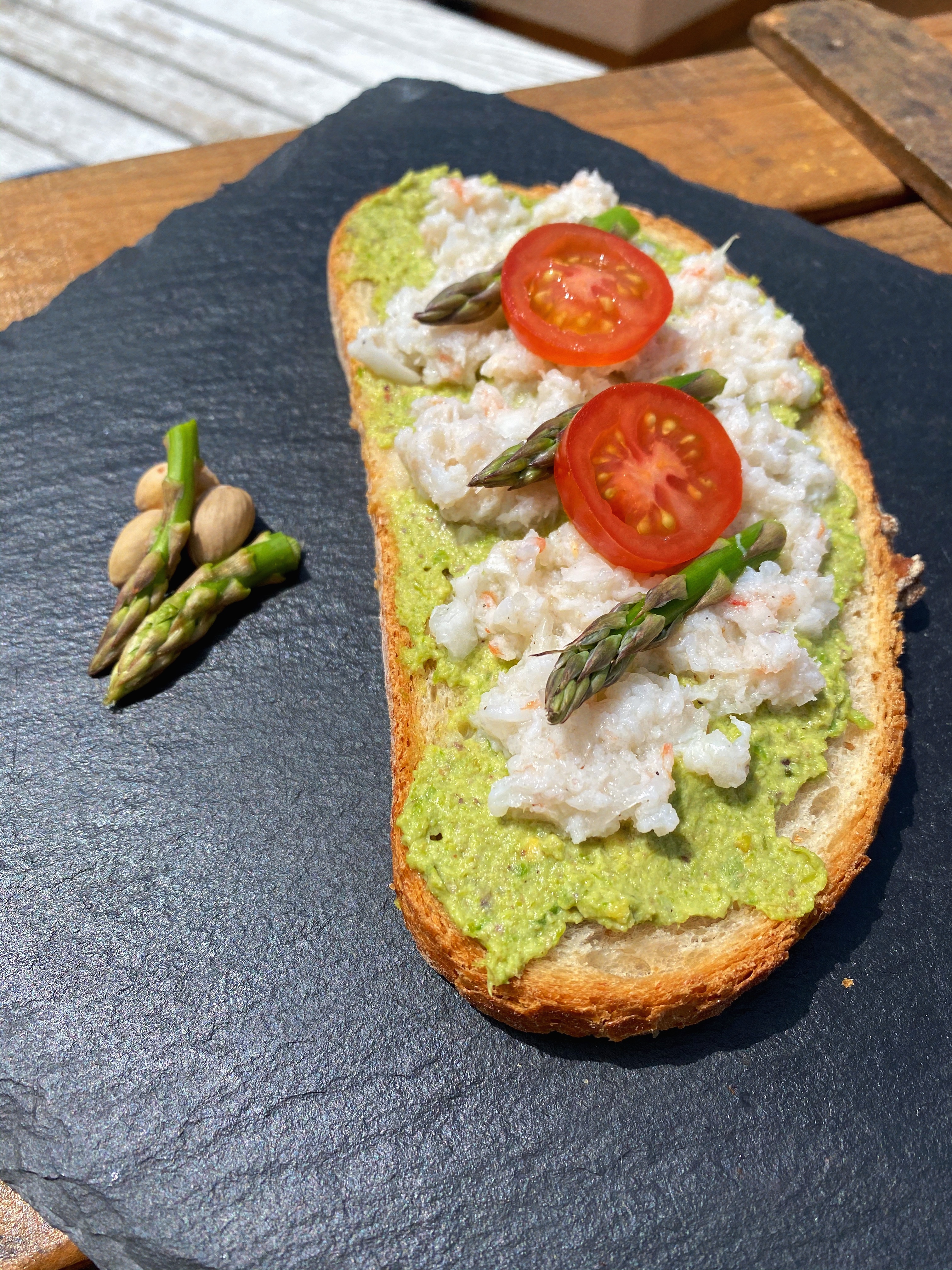 TOSTA DE PESTO DE ESPARRAGOS Y PISTACHOS CON CEVICHE DE GAMBAS