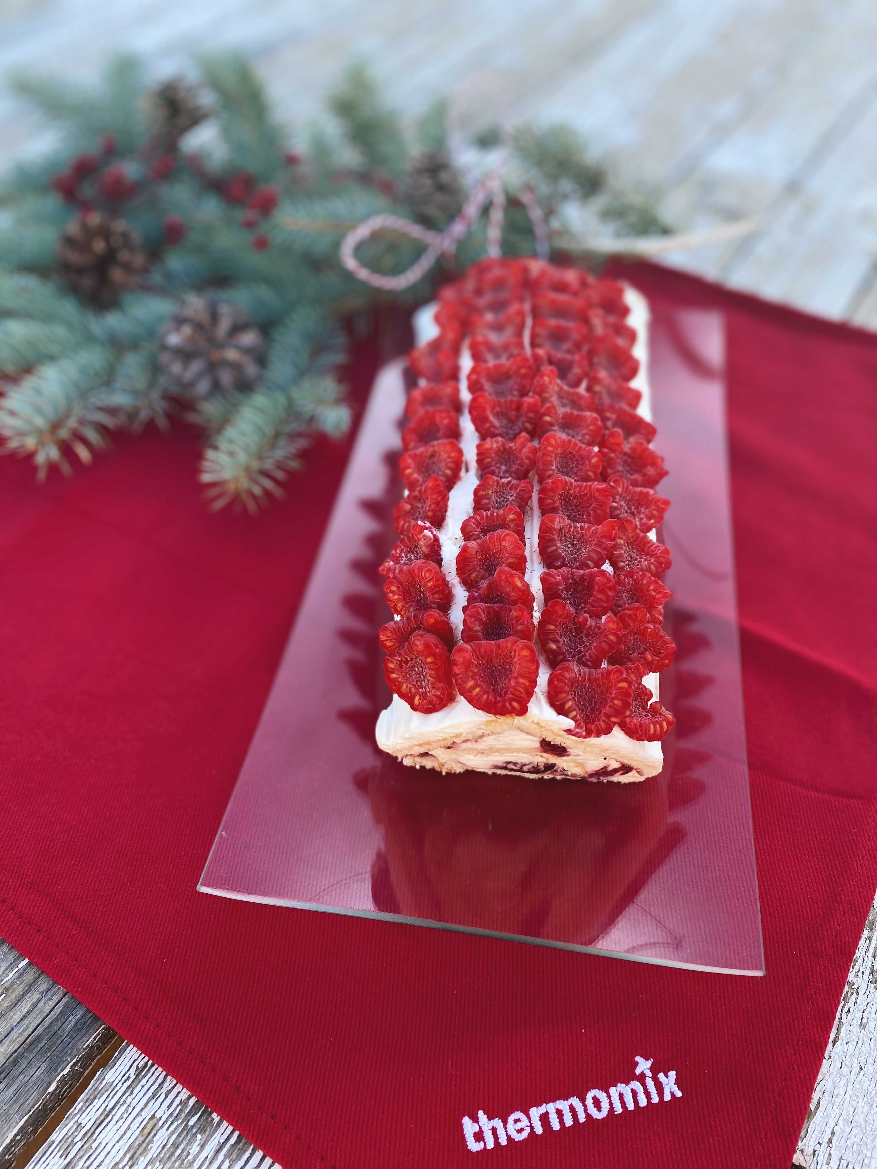 Desenrolle cuidadosamente el bizcocho, retire el paño y coloque el bizcocho sobre un rectángulo de film transparente. Extienda la mermelada por la superficie y ponga encima 2/3 de la nata montada, de manera que haya mayor cantidad en el extremo donde se empieza enrollar y dejando sin nata la última franja de bizcocho apretando bien para evitar que queden huecos. Cubra el brazo con el resto de nata montada. Corte las frambuesas por la mitad a lo largo y colóquelas, con el corte hacia arriba, formando filas una al lado de otra por toda la superficie del brazo procurando no dejar huecos libres. Reserve en el frigorífico durante 15 minutos. Corte en rebanadas y sirva.
