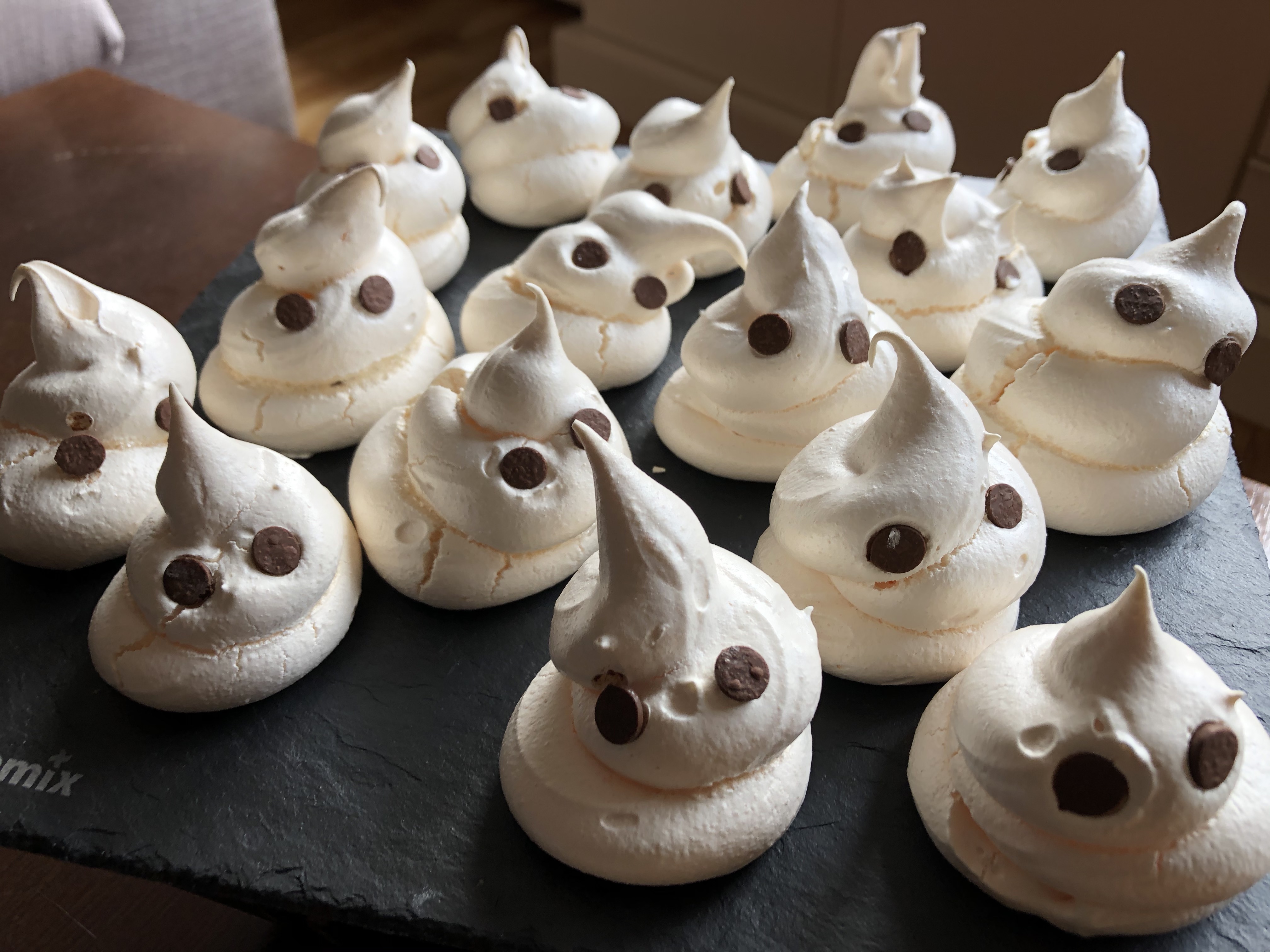 Hornee durante 40 minutos (135ºC). Después, apague el horno y deje los fantasmas dentro durante aprox. 3 horas o hasta que enfríen por completo. Retire del horno y sirva.