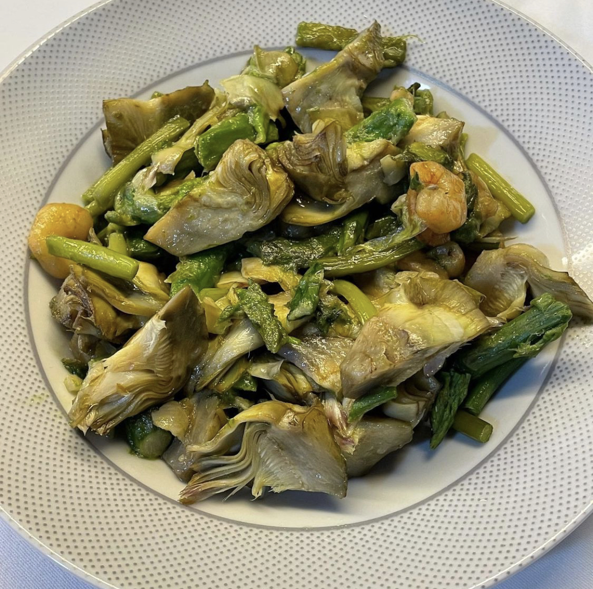 Salteado de alcachofas, espárragos y gambas
