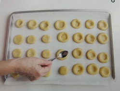 - Divida la masa en 32 porciones, deles forma de bola y repártalas en las bandejas de horno preparadas. Con una cucharilla o un bol redondo, presione el centro para darles forma de cuenco.
