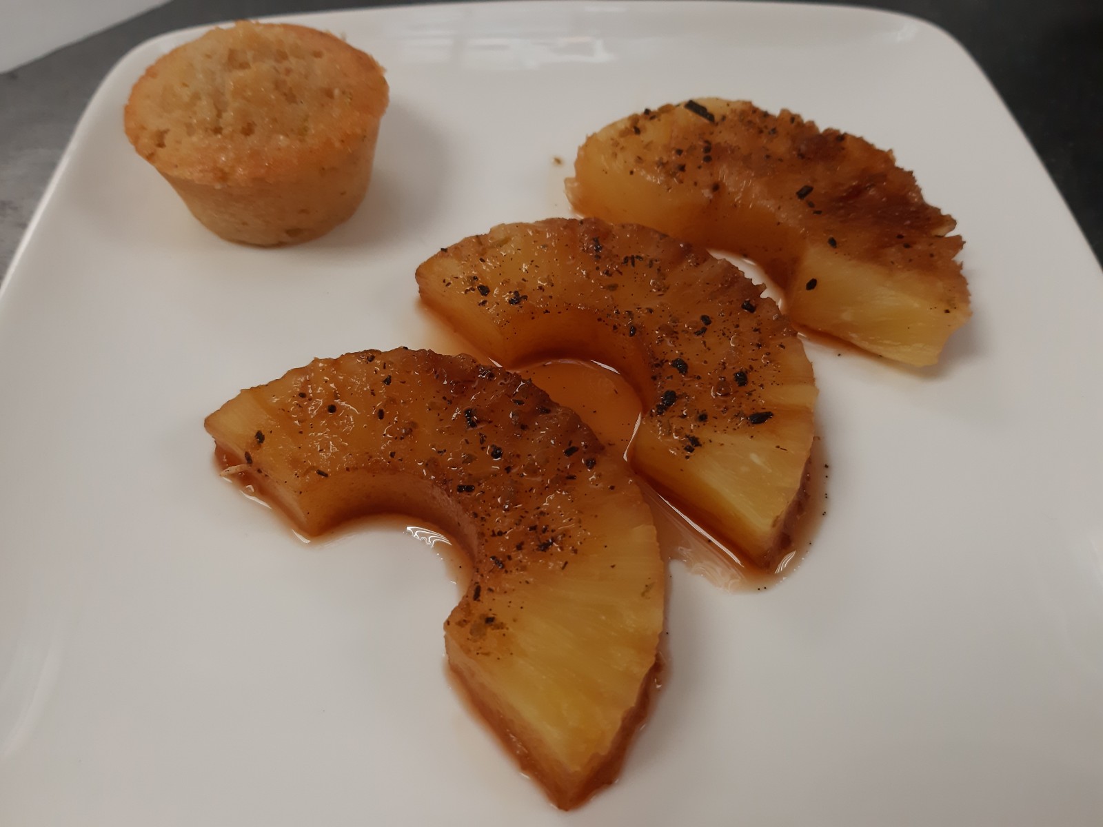 8. Para servir la piña, abra con cuidado los papillotes, coloque las lonchas de piña en platos de postre, espolvoree con la menta picada y sirva templada o fría.