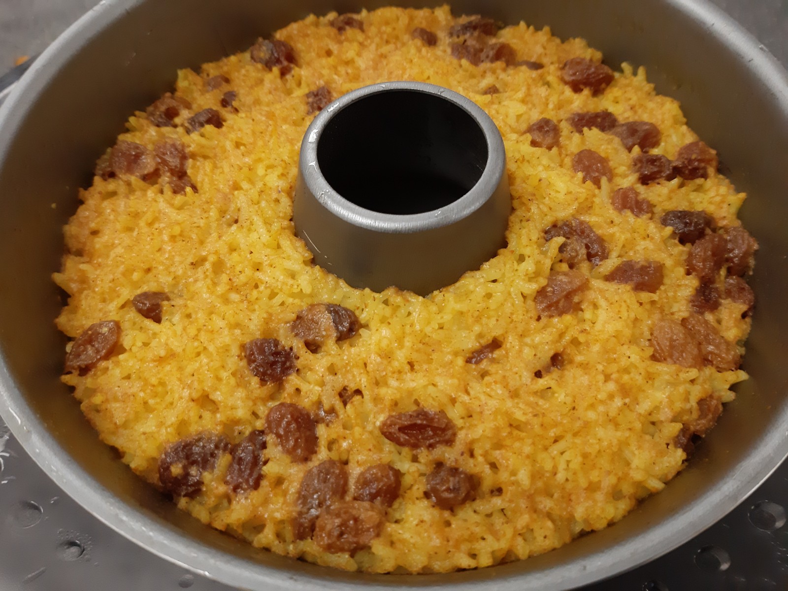 5. Ponga en el vaso el ajo y el aceite. Triture 3 seg/vel 7 baje el ajo de las paredes del vaso y sofría 3 min/120º/vel 1. Añada el agua, la sal, el curry y la cúrcuma. Mezcle 3 seg/vel 3. Sitúe en el recipiente Varoma el molde corona, ponga dentro el arroz, las pasas y vierta el líquido del vaso, tape el Varoma y reserve.