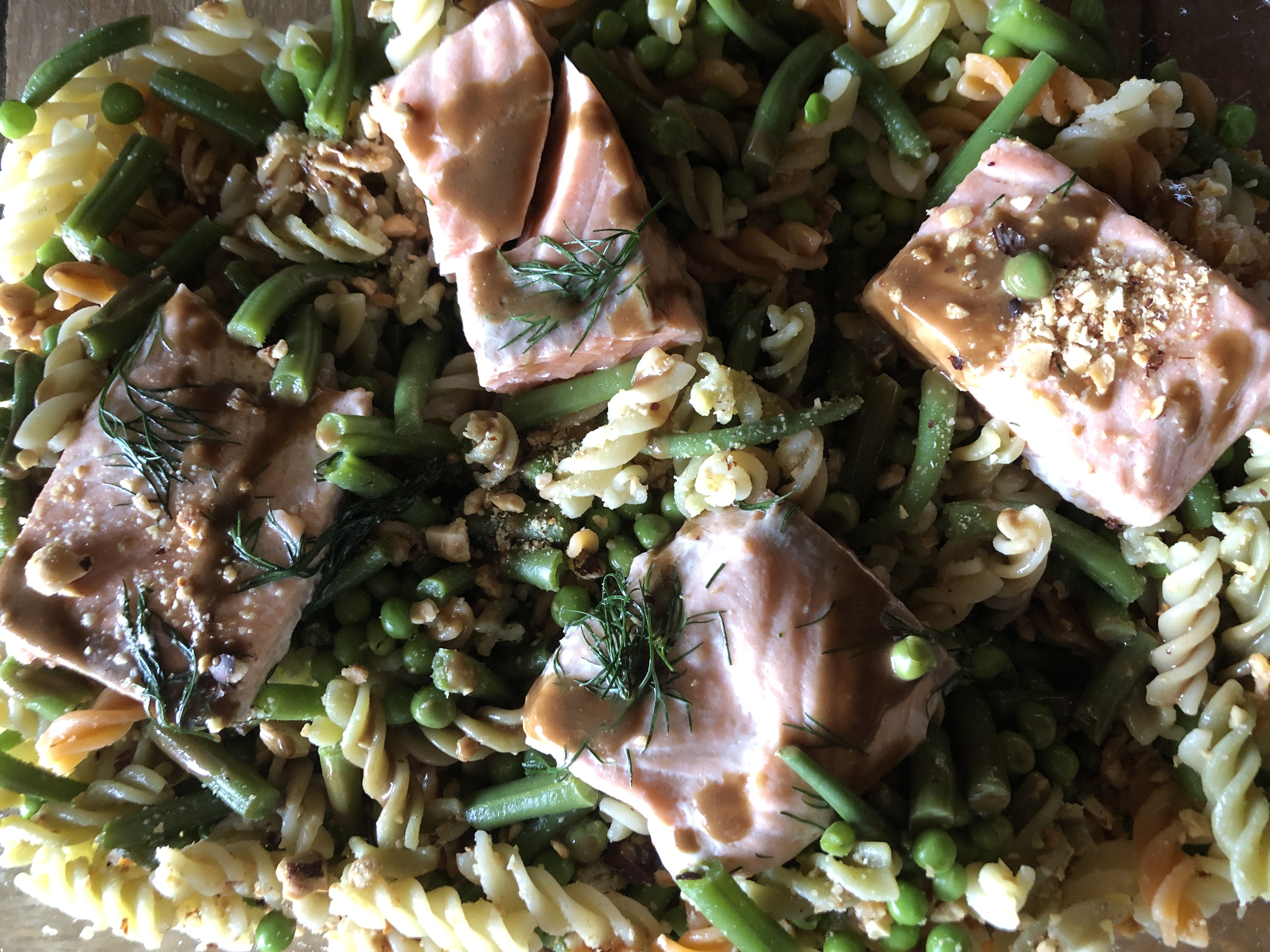 ENSALADA DE PASTA INTEGRAL Y VEGETAL CON SALMÓN, GUISANTES Y JUDIA VERDE