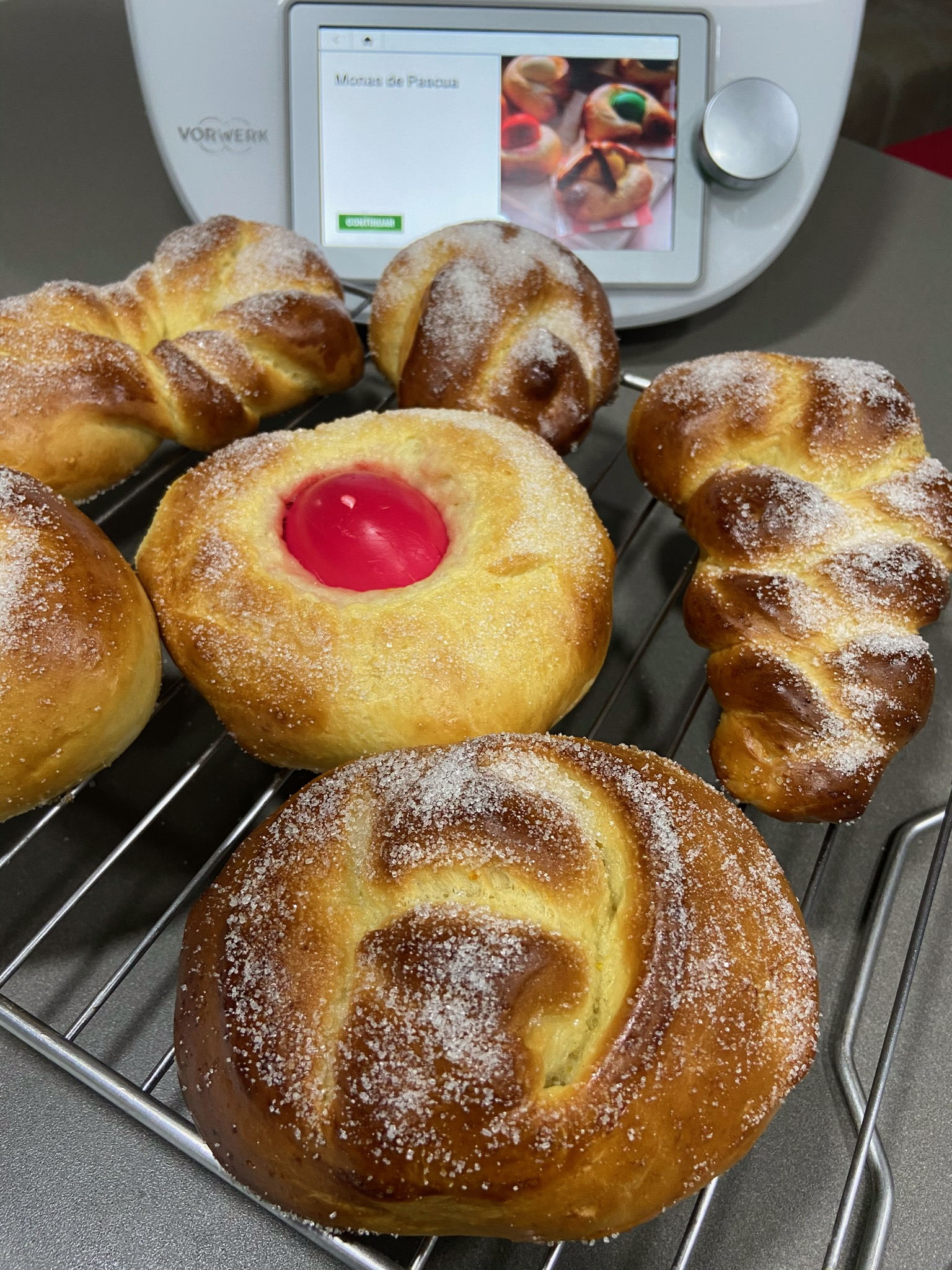 La Pascua del 2020 va a ser sin duda, una pascua diferente a cualquier Pascua que hayamos vivido hasta ahora. Tenemos un confinamiento y seguramente falta de ingredientes en nuestra despensa, será por este motivo, que este año me he decidido a hacer la clásica mona de Pascua, las que se hacían en todo el Mediterráneo antes de que Cataluña comenzara a expandir la famosa mona de chocolate. Tengo que reconocer que me ha encantado su sabor, que me recuerda bastante al roscón de Reyes,Y qué decir de los huevos de colores me han sorprendido tanto, que me han dejado entusiasmada!! Así que me decido a compartirla con todos. Los usuarios de Cookidoo , la pueden encontrar en la plataforma de manera guíada, si tienes un antiguo thermomix o no tienes acceso a la plataforma, aquí te dejo la receta.