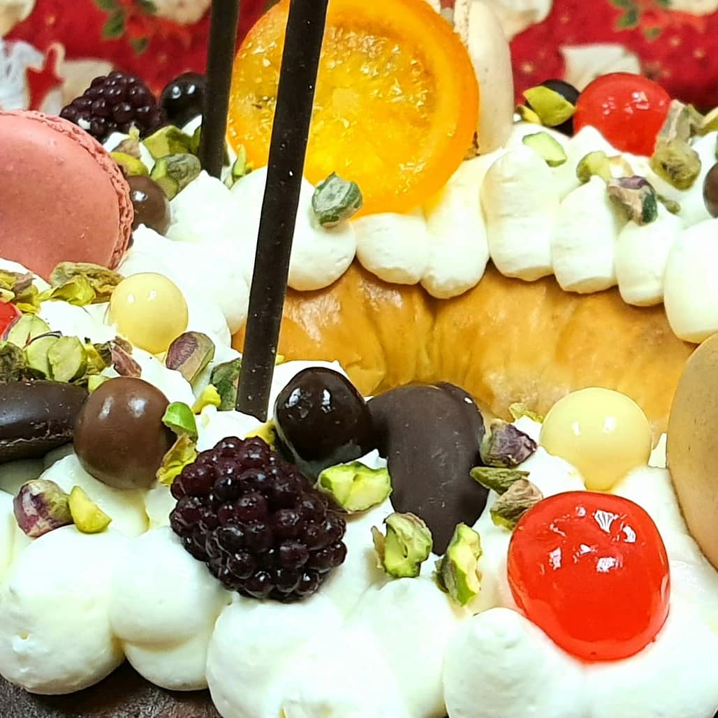 La decoración? Macarons, palitos de choco, filipinos cortados por la mitad, moras y fruta confitado ( como no!). Y para rematar unos pistachos picados que le darán el crunchi perfecto.