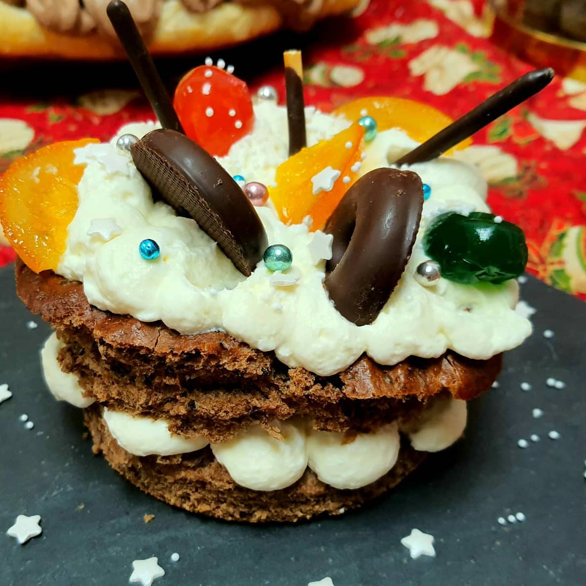 Corte el roscón por la mitad transversalmente. Coloque la base en un plato grande y forme botones iguales unidos entre sí con la mitad de la crema de mascarpone. Vuelva a poner la parte de arriba del roscón y, sobre la superficie, forme igualmente una o varias hileras de botones con el resto de la crema.Espolvoree el confeti dorado sobre la crema. Coloque todas las frutas y elementos decorativos repartidos sobre la superficie y espolvoree con los pistachos. Sirva en porciones.