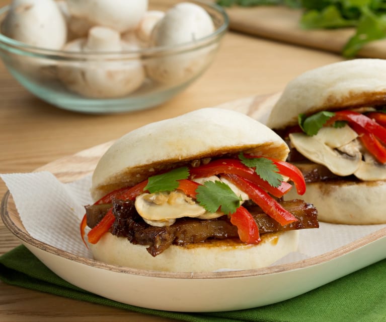 Retire el Varoma y, con cuidado de no quemarse, abra los baos, ponga una cucharadita de salsa hoisin en cada uno. Rellene con 3-4 tiras de seitán, reparta los champiñones y los pimientos y sirva decorados con el cilantro.