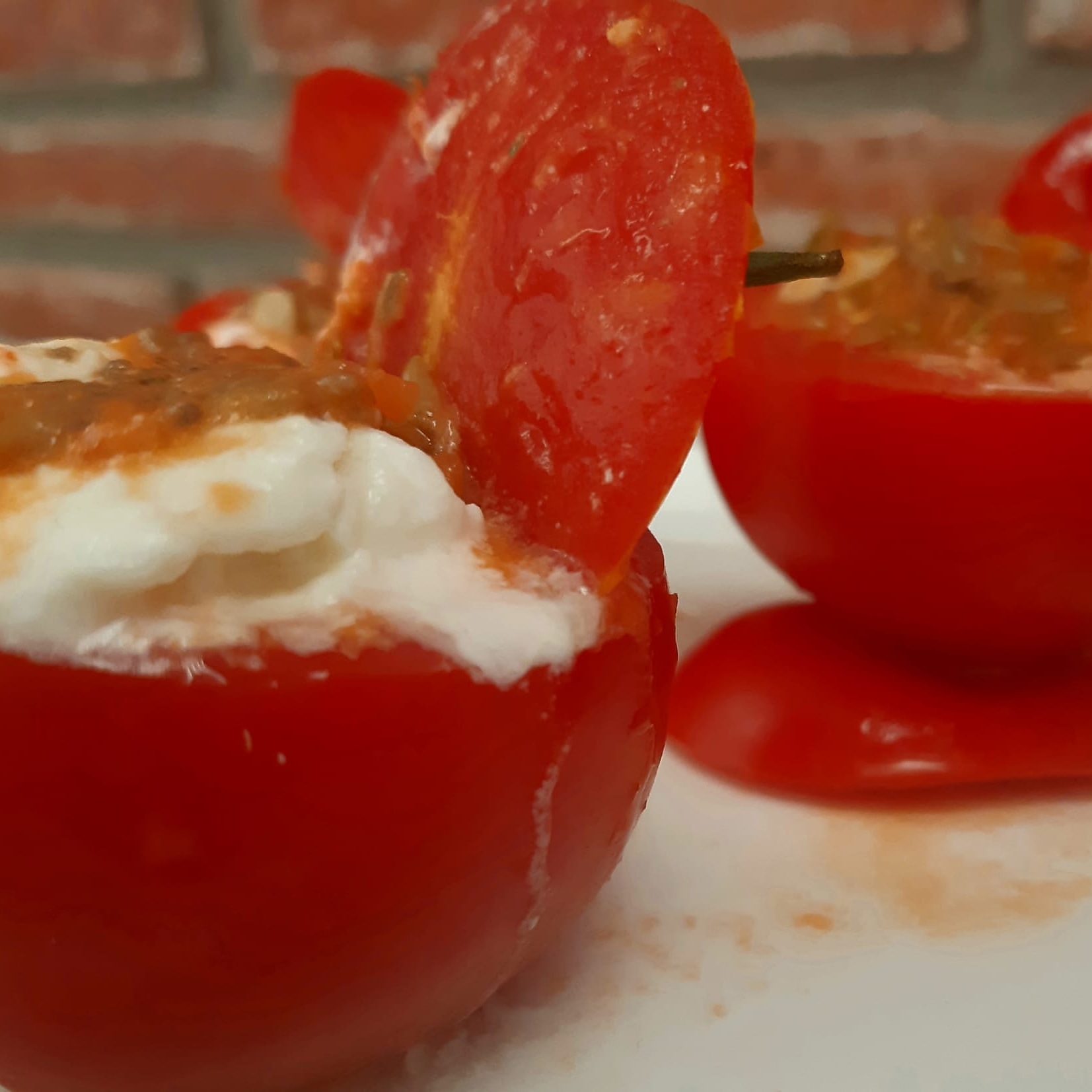 TOMATES RELLENOS DE BURRATA CON VINAGRETA DE PIPAS Y CHIA