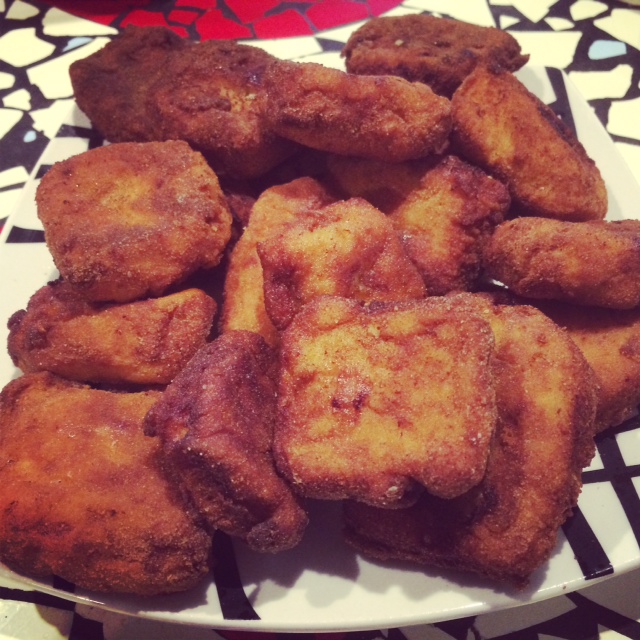 - Queda una masa con la que hacemos porciones al gusto, la pasamos por huevo y pan rallado. y ya tenemos los Nuggets listos para freír en abundante aceite.