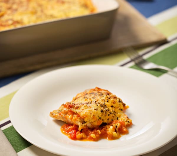 Hornee durante 10-15 minutos (200°C) o hasta que el queso esté dorado. Sirva caliente.