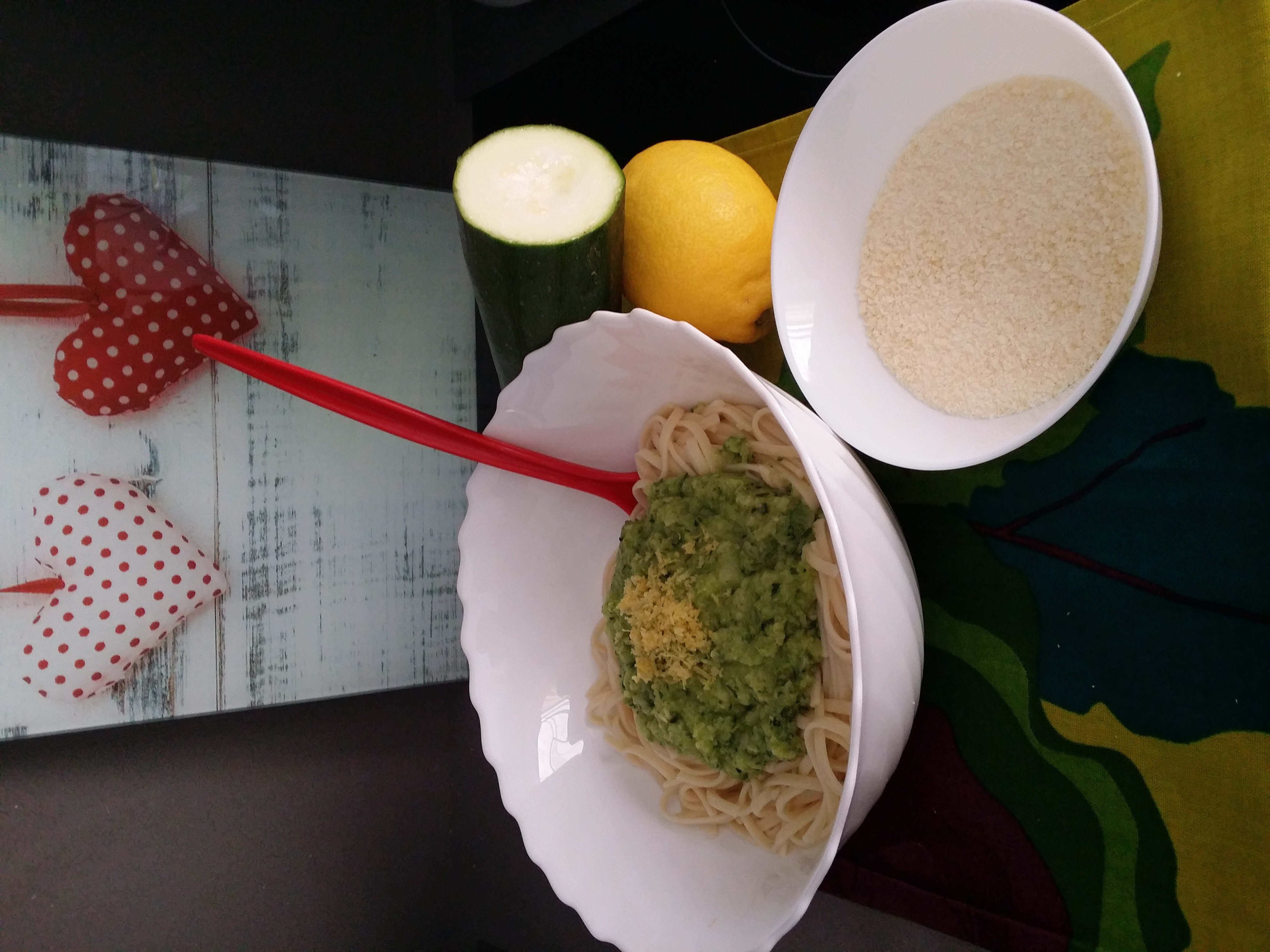 Ponga los tallarines escurridos en una fuente honda. Ralle la piel del limón (reserve la ralladura) y exprima el limón (reserve el zumo). Vierta sobre la pasta los calabacines con menta, la ralladura de piel del limón, el zumo del limón y el agua reservada de cocer la pasta. Agregue 2 cucharadas de queso parmesano rallado y remueva bien. Sirva inmediatamente acompañado con el parmesano rallado restante aparte.