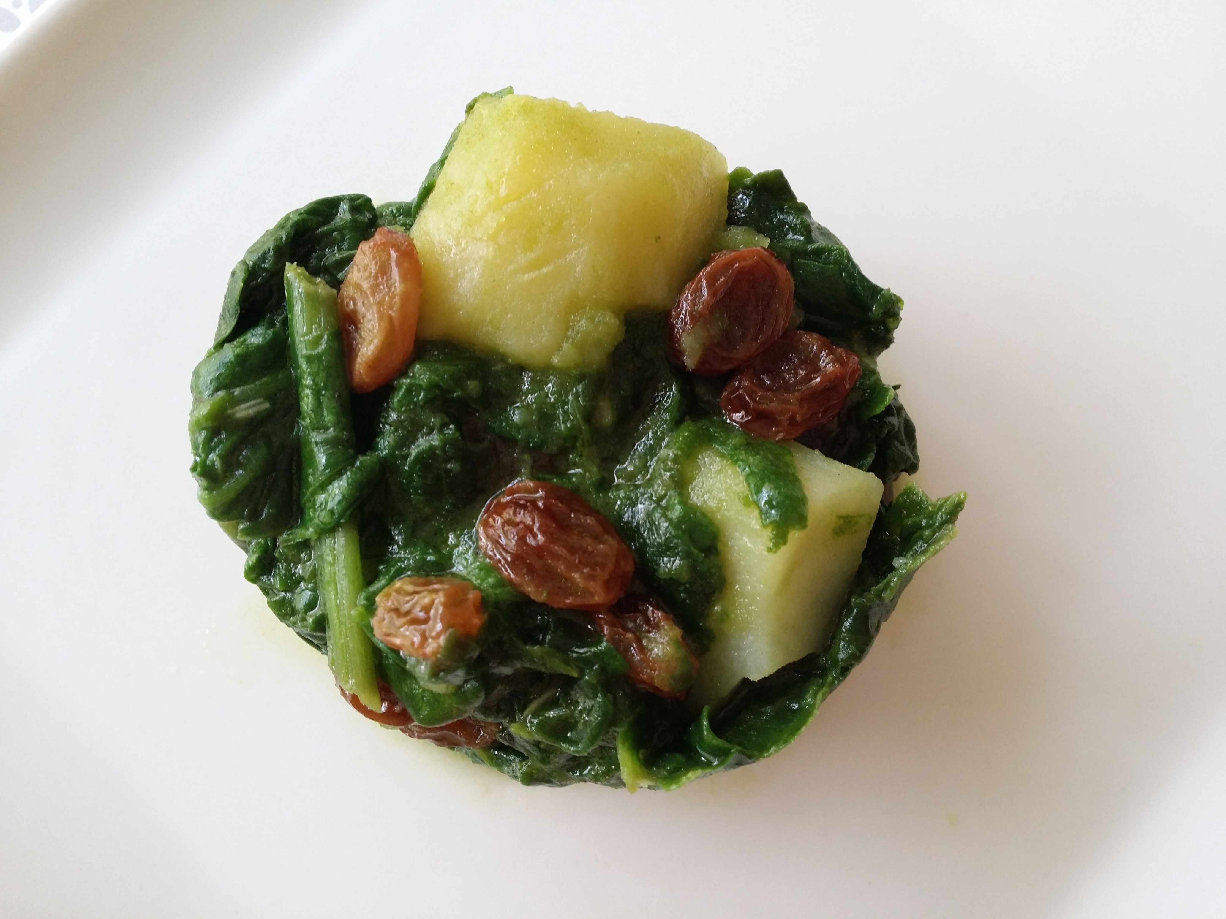 Añada las pasas, las espinacas, la mantequilla, los piñones, la pastilla de caldo desmenuzada y la pimienta (las espinacas ocupan todo el volumen del vaso, pero bajan con la cocción). Programe 12 min/100°C/vel 1. Retire la mariposa y añada el vinagre. Vierta en una fuente y sirva inmediatamente.