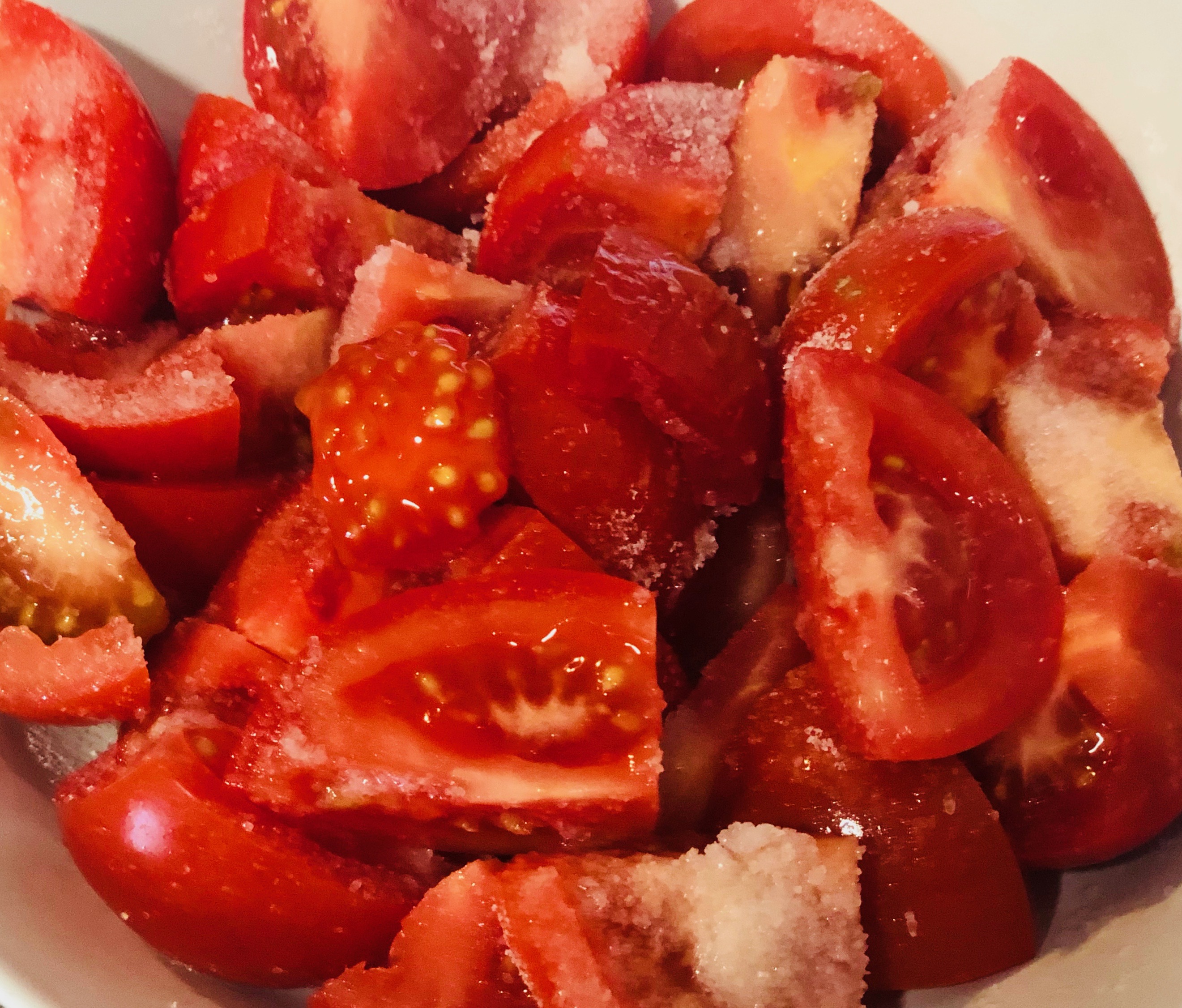 2. Corta los tomates en cuartos y bañarlos con la sal, para que suelten la mayor cantidad de liquido posible ,