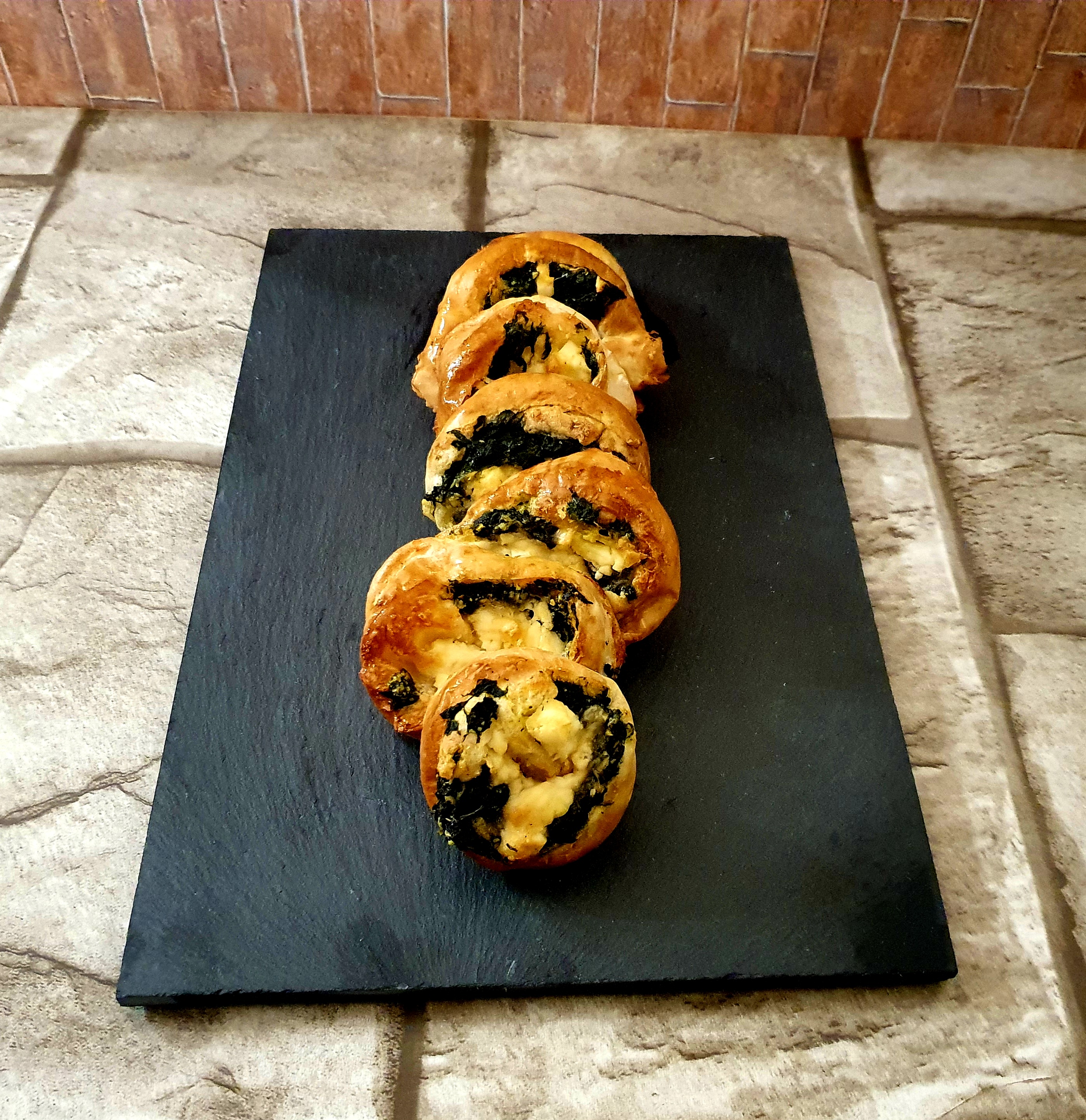 Extienda la lámina de hojaldre en una mesa de trabajo y pincélela con el huevo batido. Distribuya las espinacas sobre el hojaldre, dejando un borde de 2 cm libre en uno de los extremos más largos. Espolvoree el queso parmesano reservado y reparta el queso feta. Enrolle el hojaldre como si fuera un brazo de gitano, córtelo en rodajas de 1,5 cm de grosor y colóquelas en la bandeja de horno. Con ayuda de la espátula, presione ligeramente cada rodaja y pincele con el huevo batido.