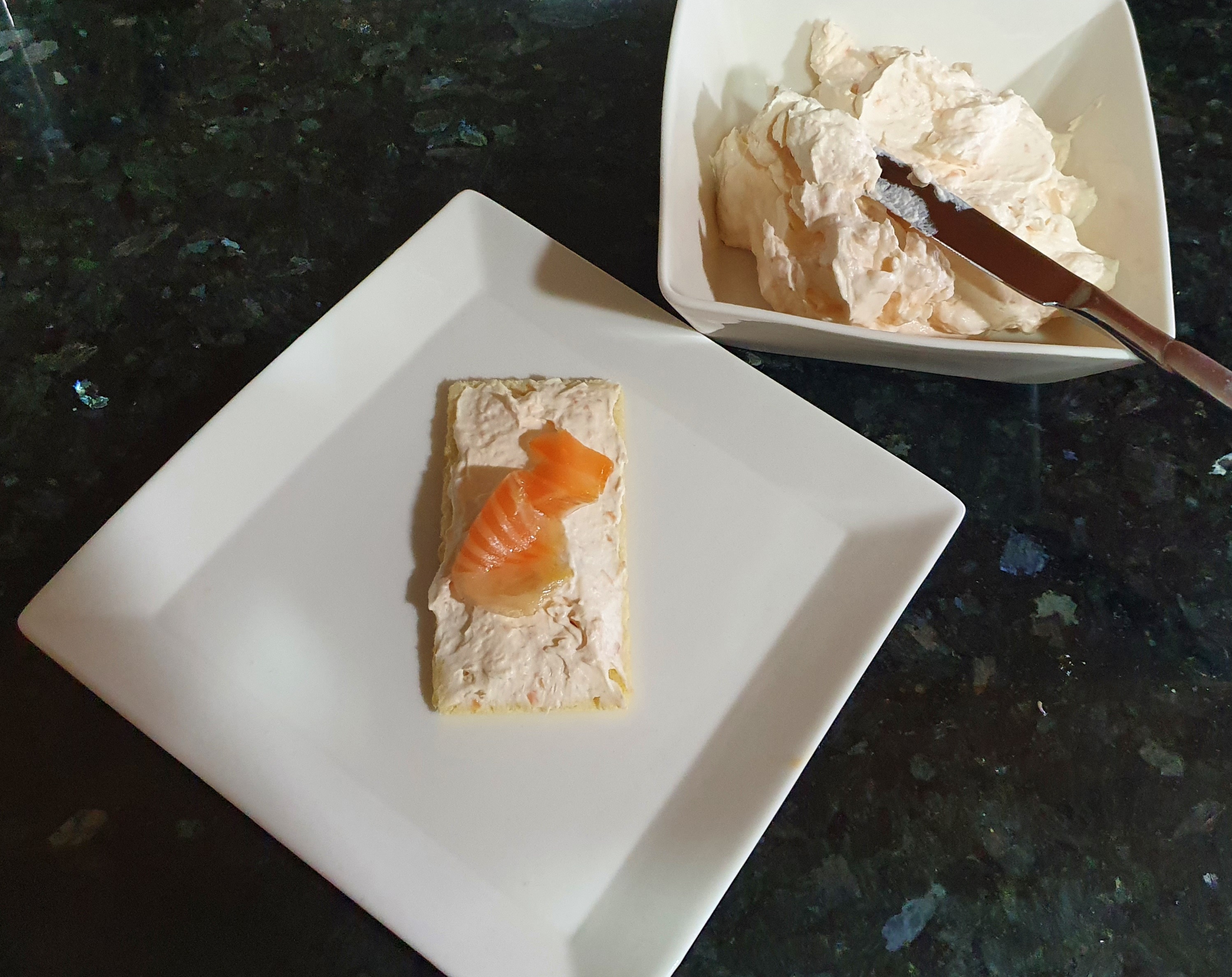 Ponga el salmón en el vaso y programe 3 vel/vel 5. Con la ayuda de la espátula baje el salmón al fondo del vaso, coloque la mariposa y sin programar tiempo monte la nata y el salmón a vel 3 hasta que este montada cremosa.