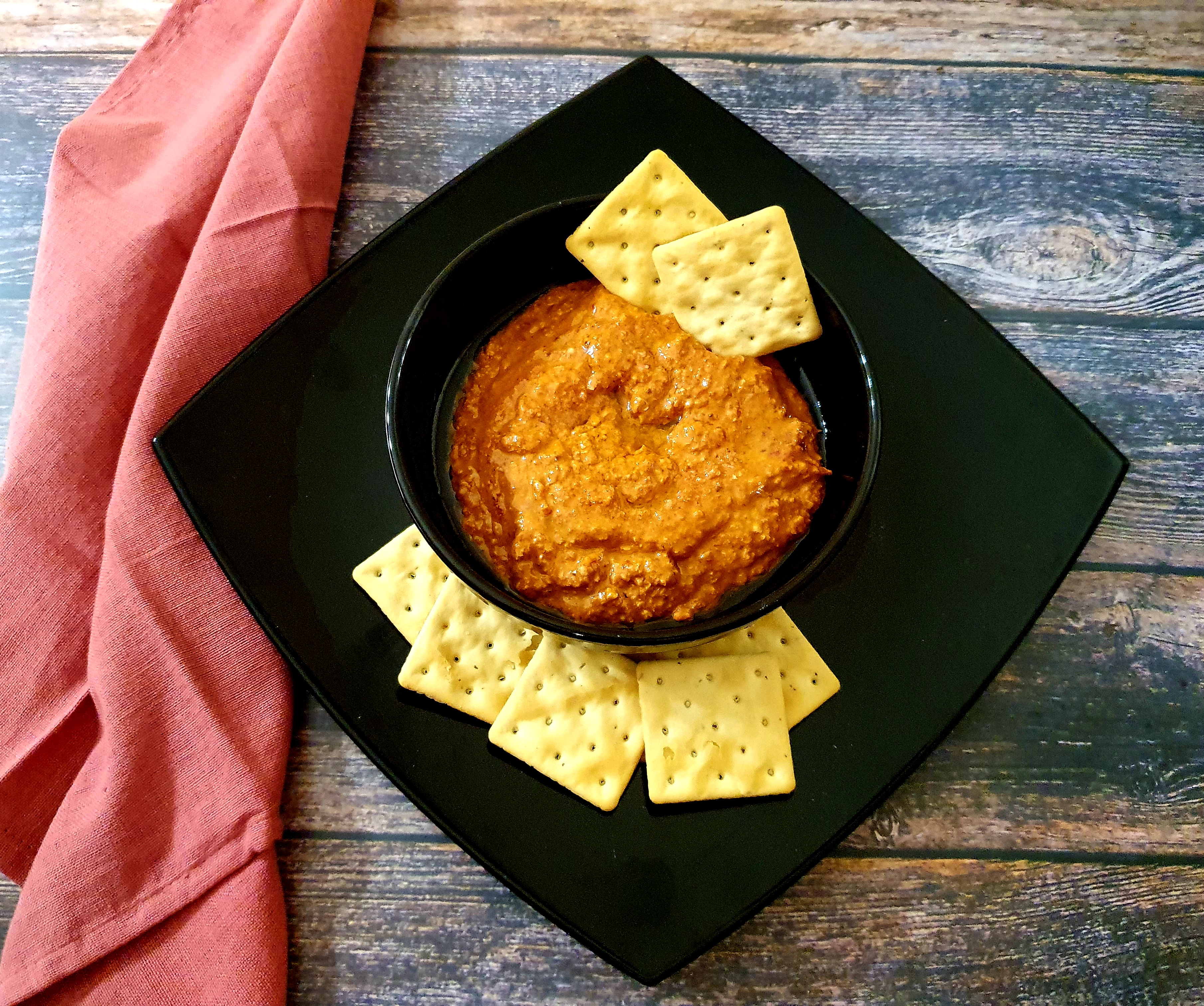 Ponga en el vaso los pimientos asados, los ajos, las nueces hidratadas y escurridas, la melaza de granada, la pimienta de cayena, el pimentón y el comino y triture 10 seg/vel 9. Después, programe 1 min/vel 3. Mientras tanto, vierta el aceite reservado sobre la tapa. Retire del vaso y sirva acompañado de crudités y pan pita.