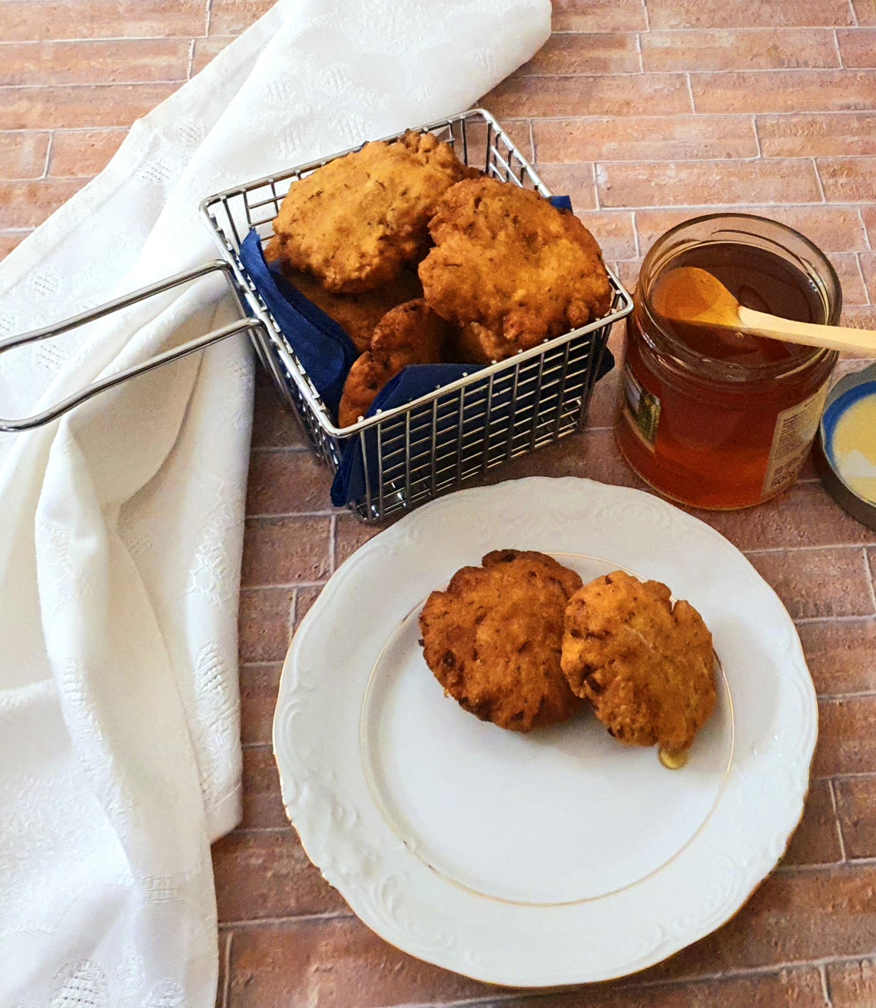 En una sartén honda con el aceite muy caliente, vierta 2-3 cucharadas grandes de la mezcla (separadas entre sí) y extiéndalas un poco con la parte convexa de la cuchara. Fría por ambos lados unos minutos, hasta que estén doradas, y retire sobre papel de cocina. Fría por tandas hasta terminar con la masa y sirva inmediatamente regadas con la miel de caña.