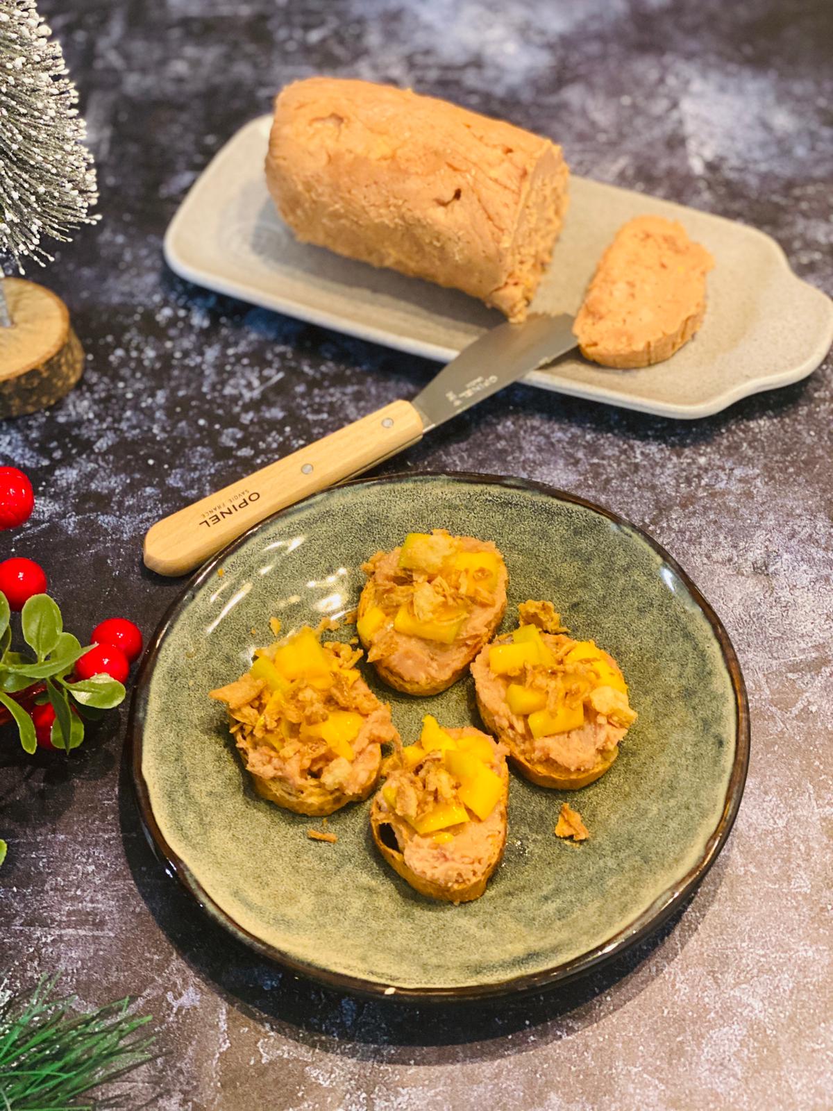Corte el turrón de foie en rodajas de 5 mm y póngalas sobre los biscotes o las tostadas. Coloque encima un trozo o dados de mango, espolvoree con cebolla frita y sirva.