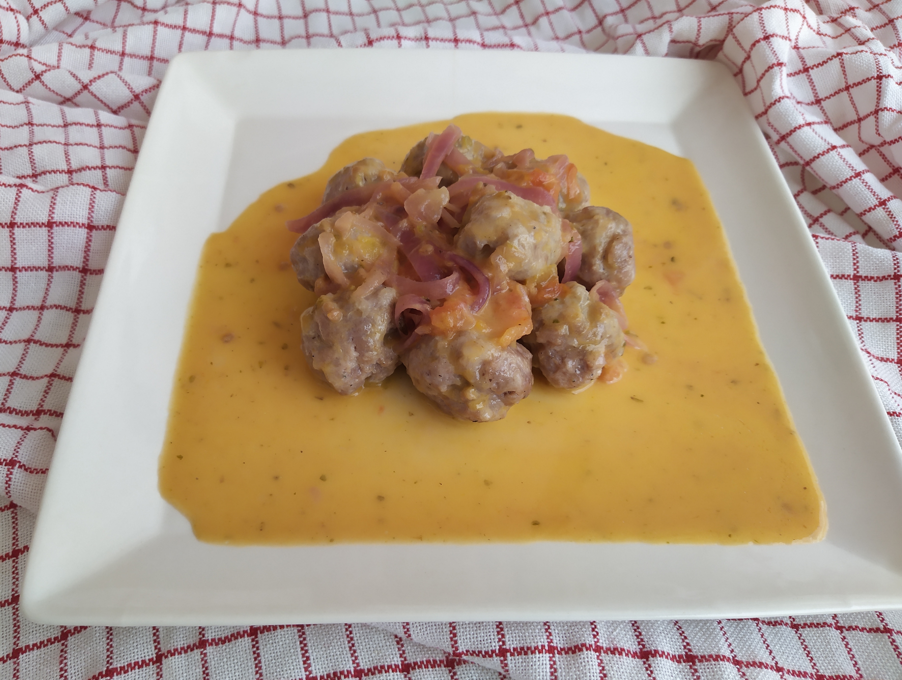 Agregue los tomates y la sal e introduzca el cestillo con las albóndigas. Programe 20-25 min/100°C/giro inverso/vel 1. Con la muesca de la espátula, extraiga el cestillo. Ponga las albóndigas en una fuente y vierta la salsa del vaso por encima. Sirva inmediatamente.