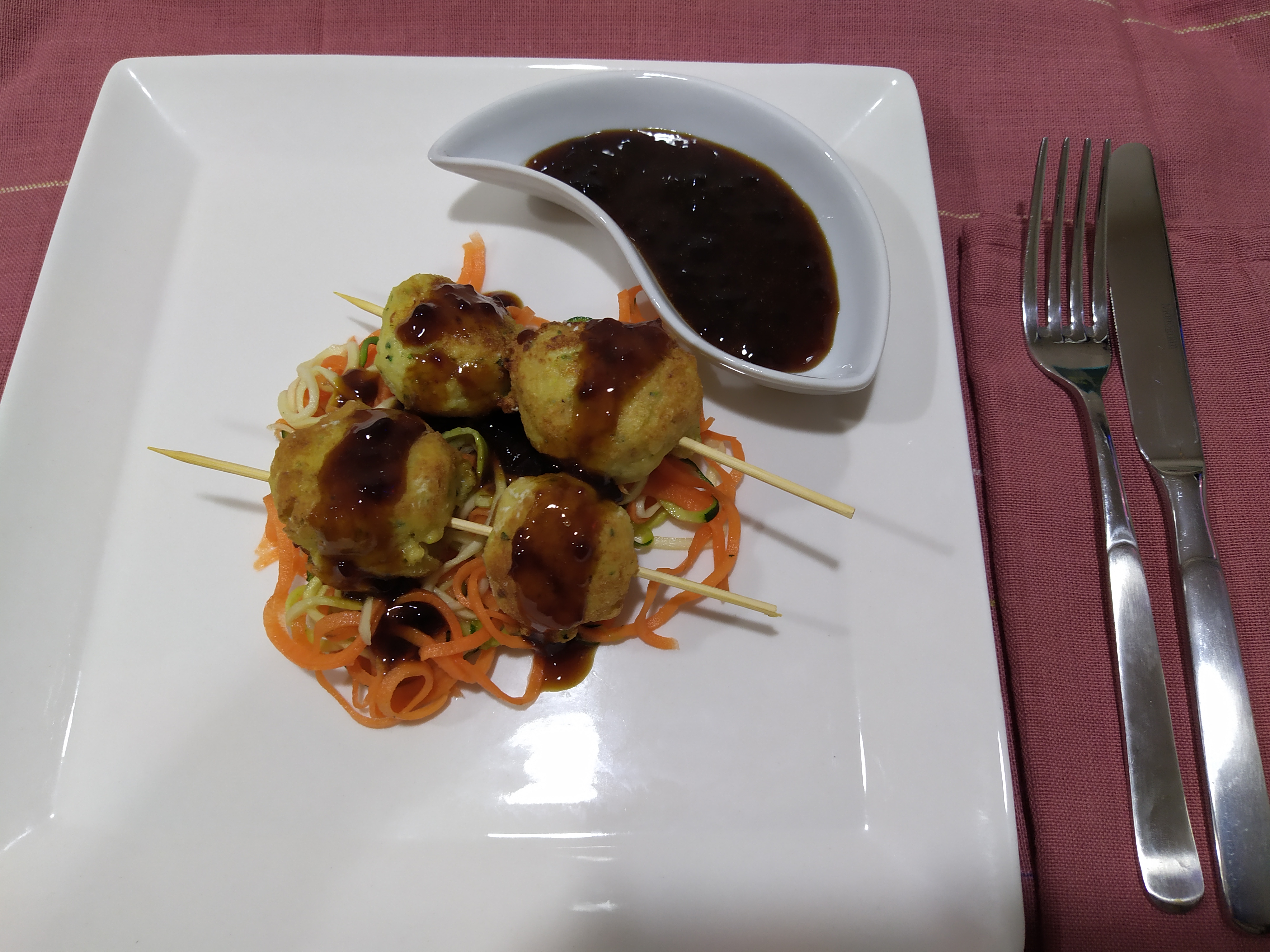 Caliente el aceite en una sartén, fría las albóndigas hasta que estén doradas y escúrralas sobre papel de cocina. Sirva las albóndigas insertadas en una brocheta, sobre una cama de calabacín y zanahoria crujientes y regadas con un chorrito de salsa teriyaki.