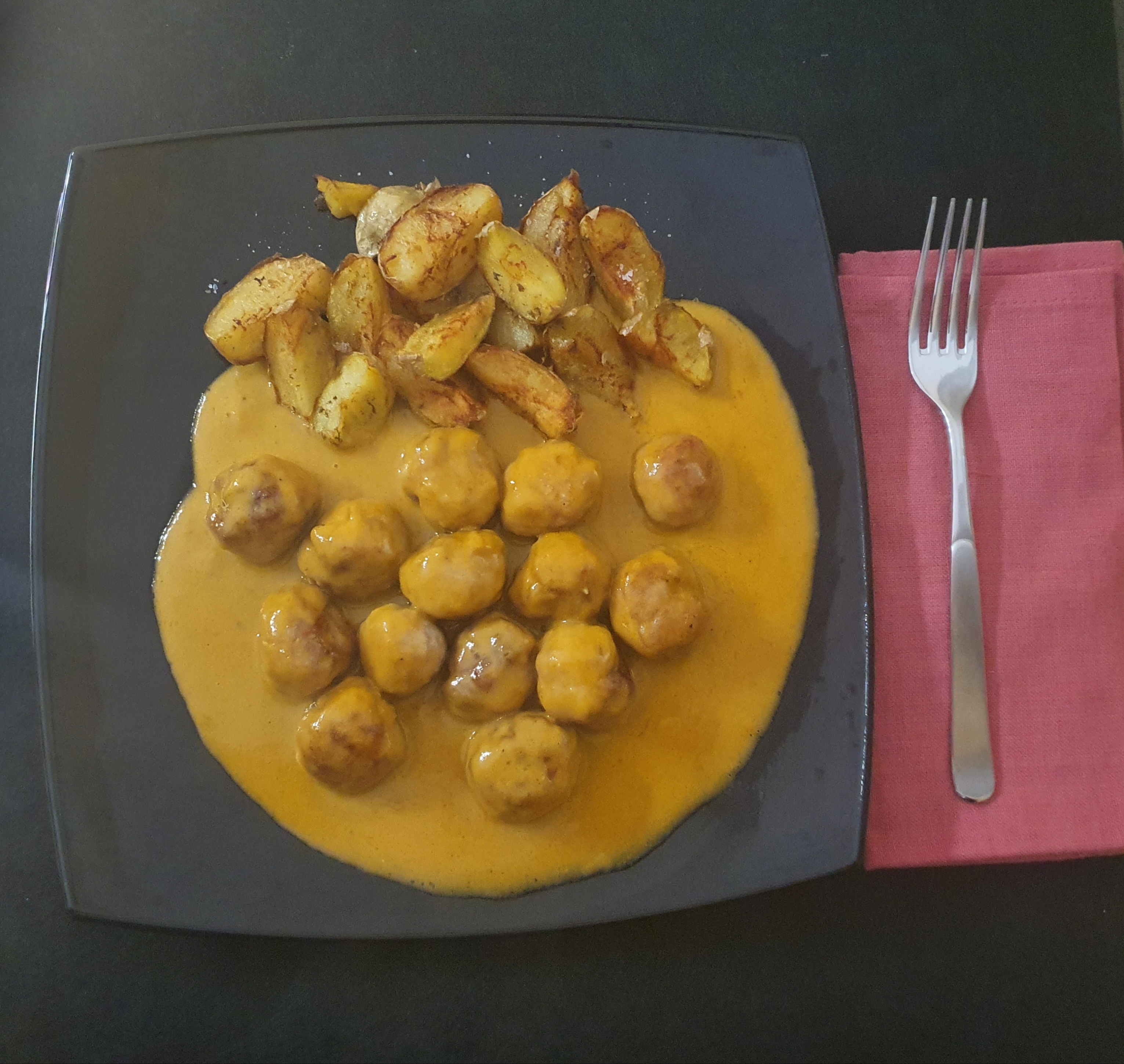Añada el pimentón, la harina, el tomate frito, la sal, la pimienta y el caldo y programe 20 min/100°C/vel 1. Espere unos minutos a que baje la temperatura y triture la salsa 30 seg/vel 9. Vierta la salsa sobre las albóndigas y hornee 10 minutos (200°C). Sirva inmediatamente.