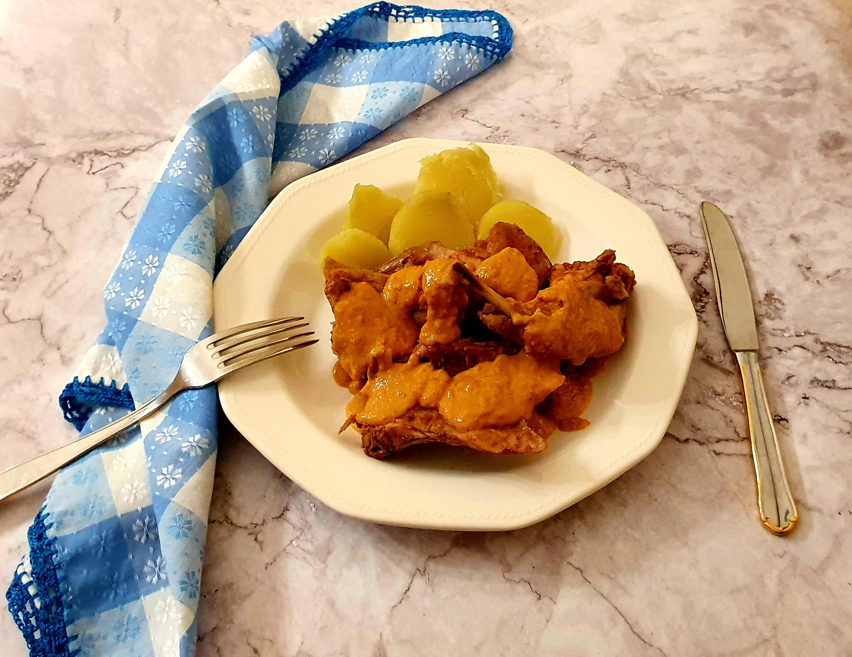 Retire el Varoma y reserve. Con unas pinzas, retire la carne del vaso y póngala en una fuente. Incorpore al vaso las almendras y triture 20 seg/vel 10. Vierta la salsa sobre el conejo y sirva con las patatas espolvoreadas con 1 cucharadita de sal.
