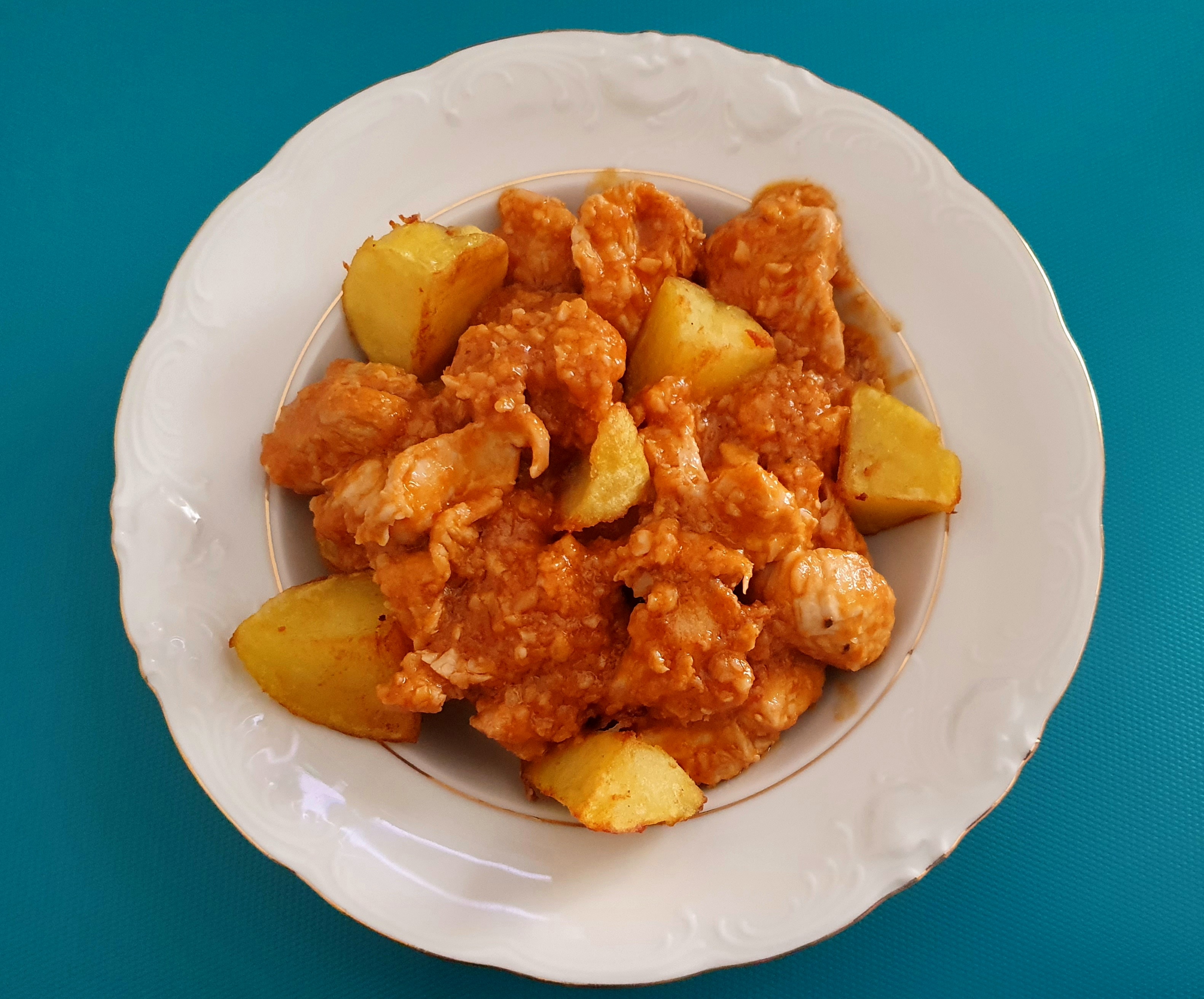 Puede servir acompañado de patatas fritas en dados.