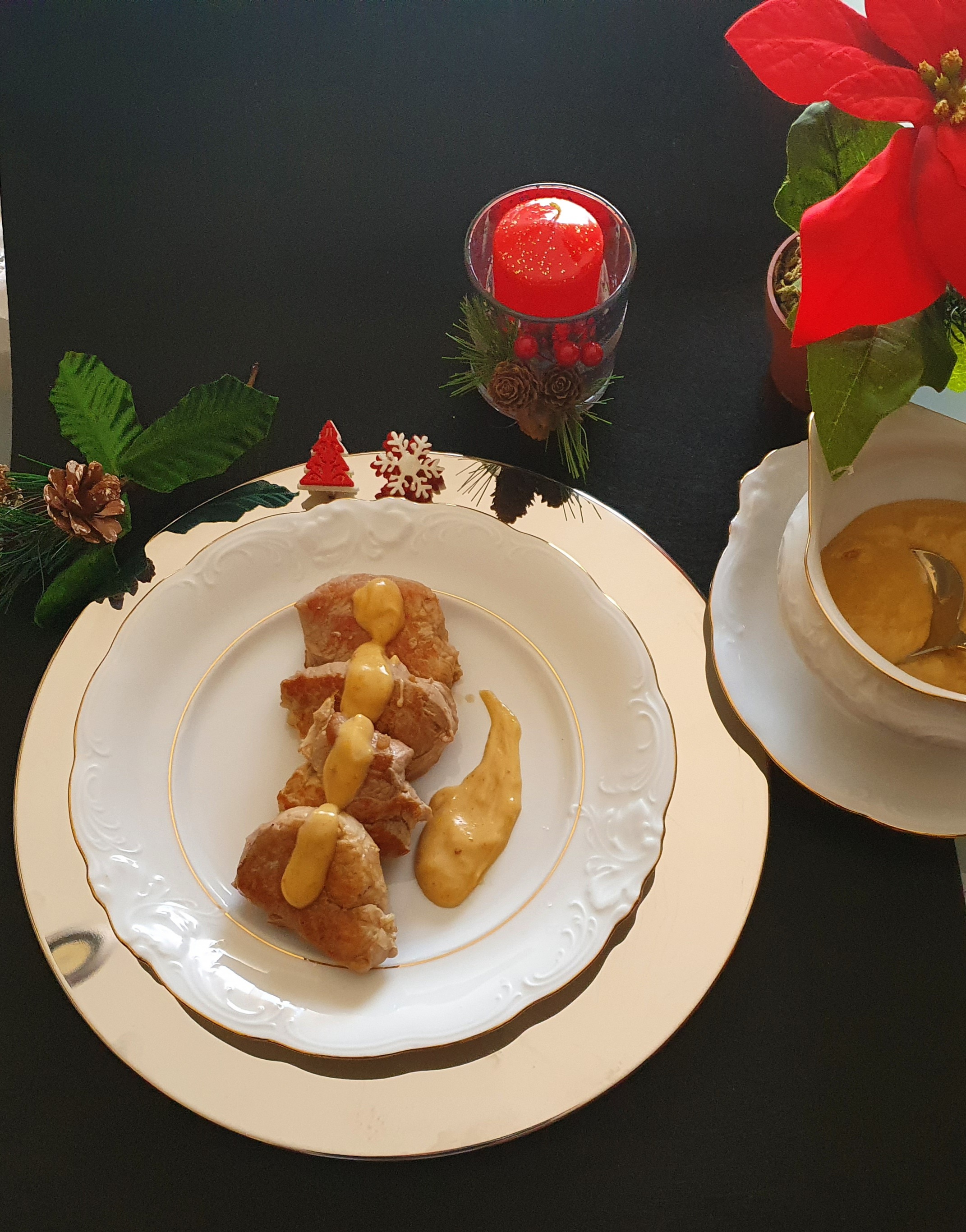 Medallones de solomillo de cerdo flambeado y salsa de turrón