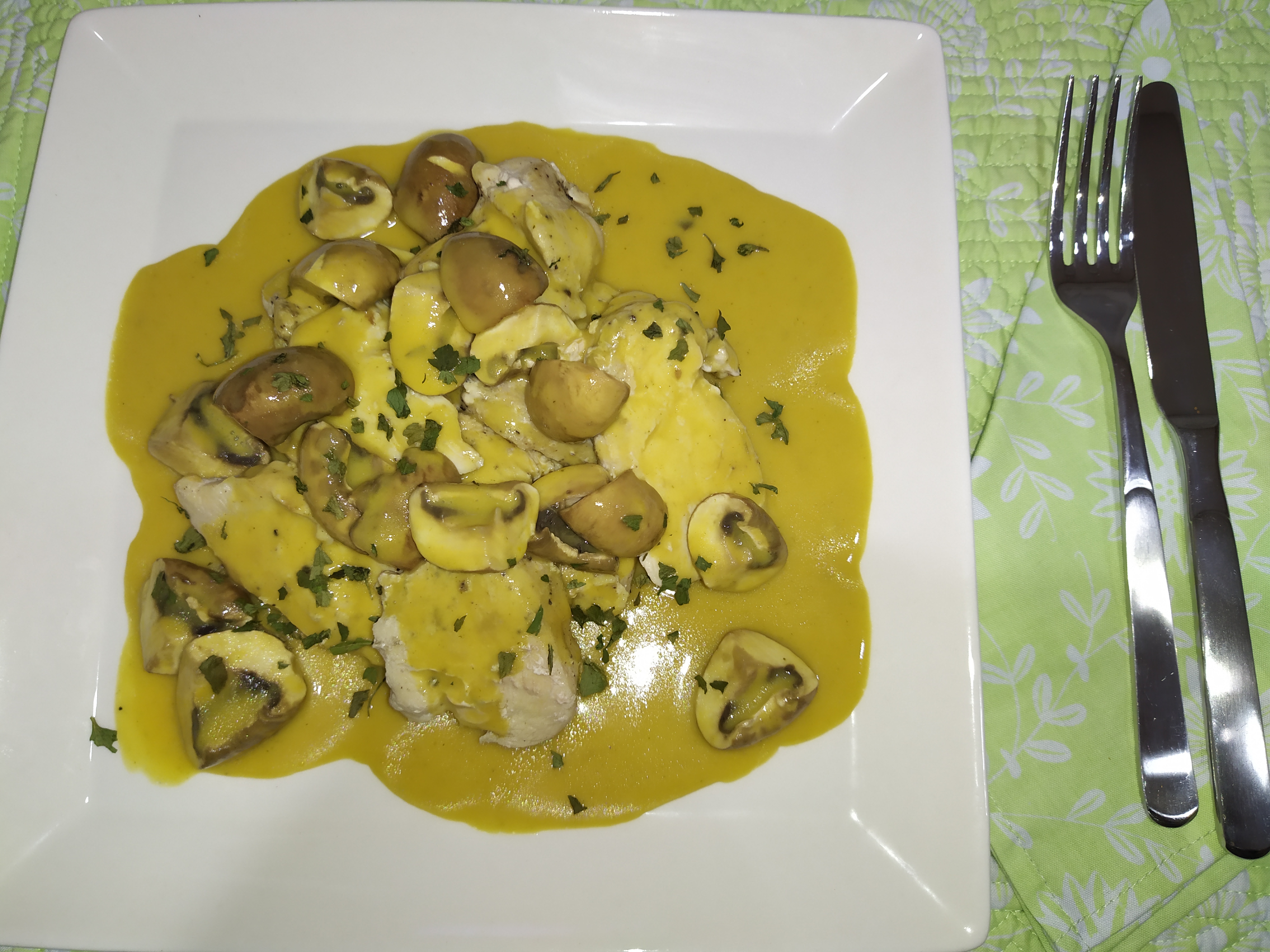 Agregue los champiñones vaporizados y la mantequilla y programe 1 min/80°C//vel 1. Ajuste los condimentos a su gusto y sirva el pollo y la salsa por separado o mezclados.