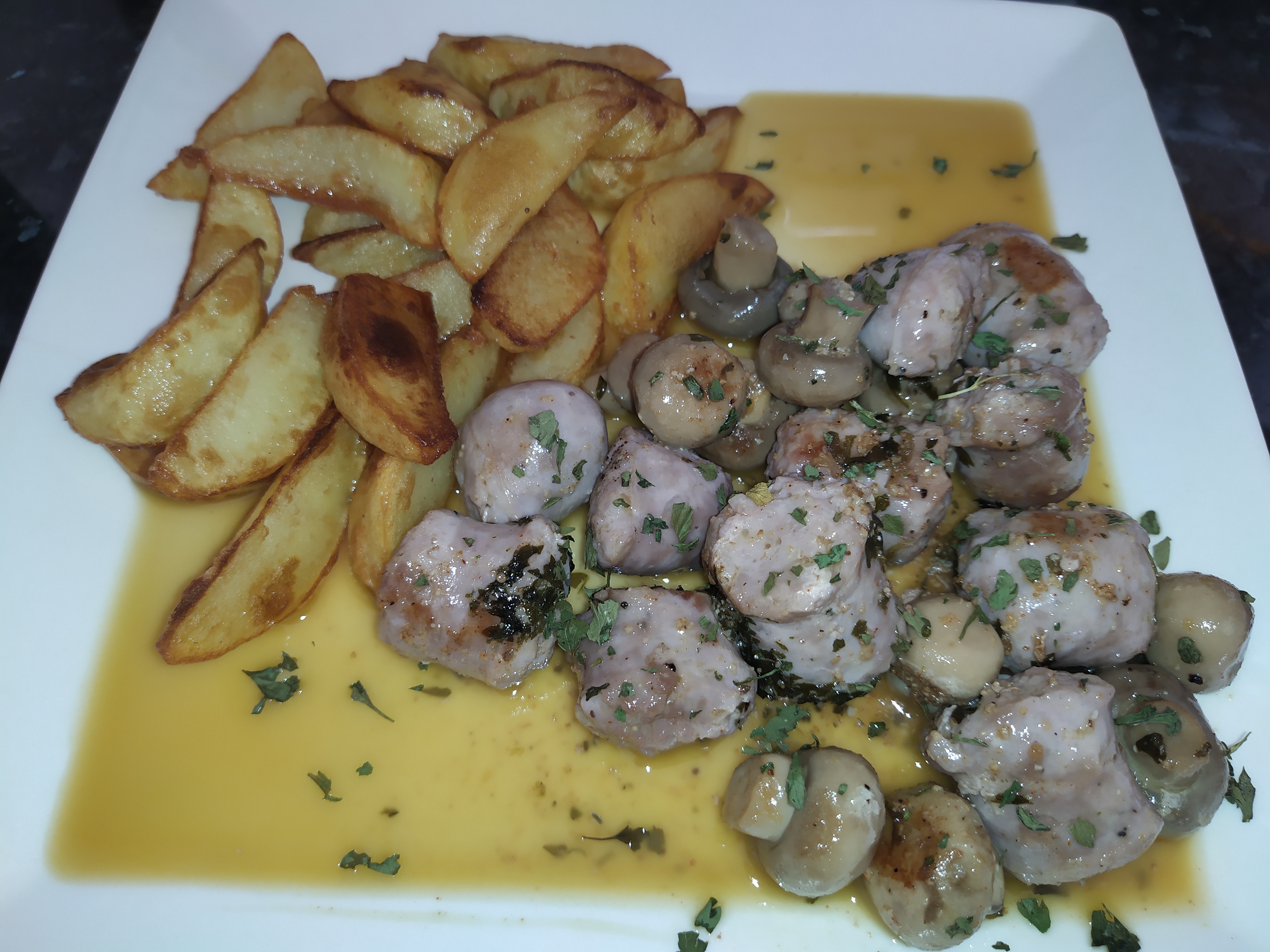 Salteado de butifarras y champiñones