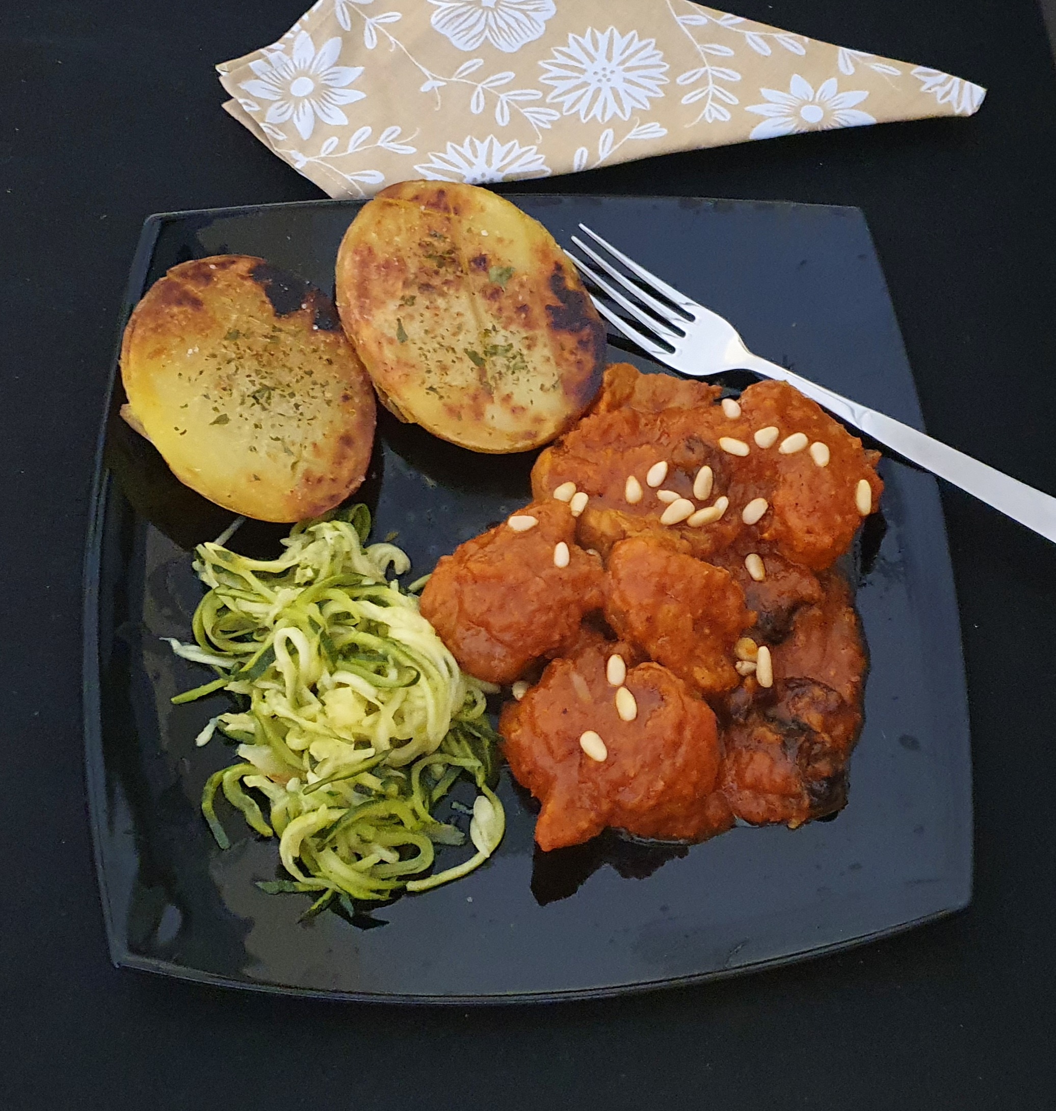 Incorpore el brandy, el oporto, el solomillo reservado, las ciruelas, los orejones y la mostaza. Sitúe el recipiente Varoma en su posición con las espirales de calabacín. Tape el Varoma y programe 12 min/Varoma/giro inverso/vel cuchara. Retire a una fuente, espolvoree los piñones y sirva.