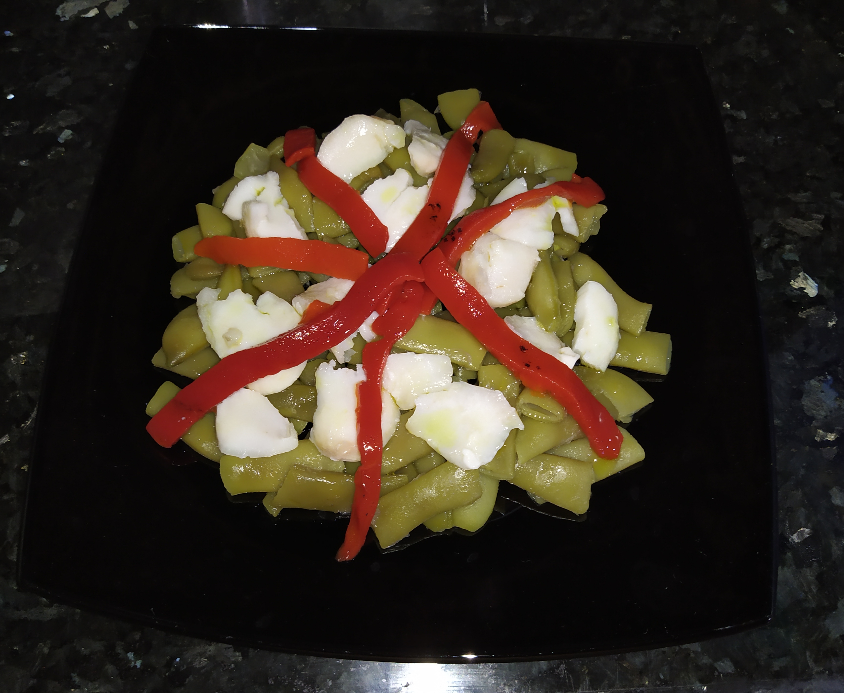 Ponga en el vaso el ajo y el aceite. Pique 5 seg/vel 7 y sofría 6 min/120°C/vel 1. Mientras tanto, coloque las judías en una fuente de servir y espolvoréelas con la sal. Separe las lascas del bacalao, póngalas sobre las judías y distribuya encima las tiras de pimiento. Vierta el contenido del vaso en la fuente y sirva inmediatamente.