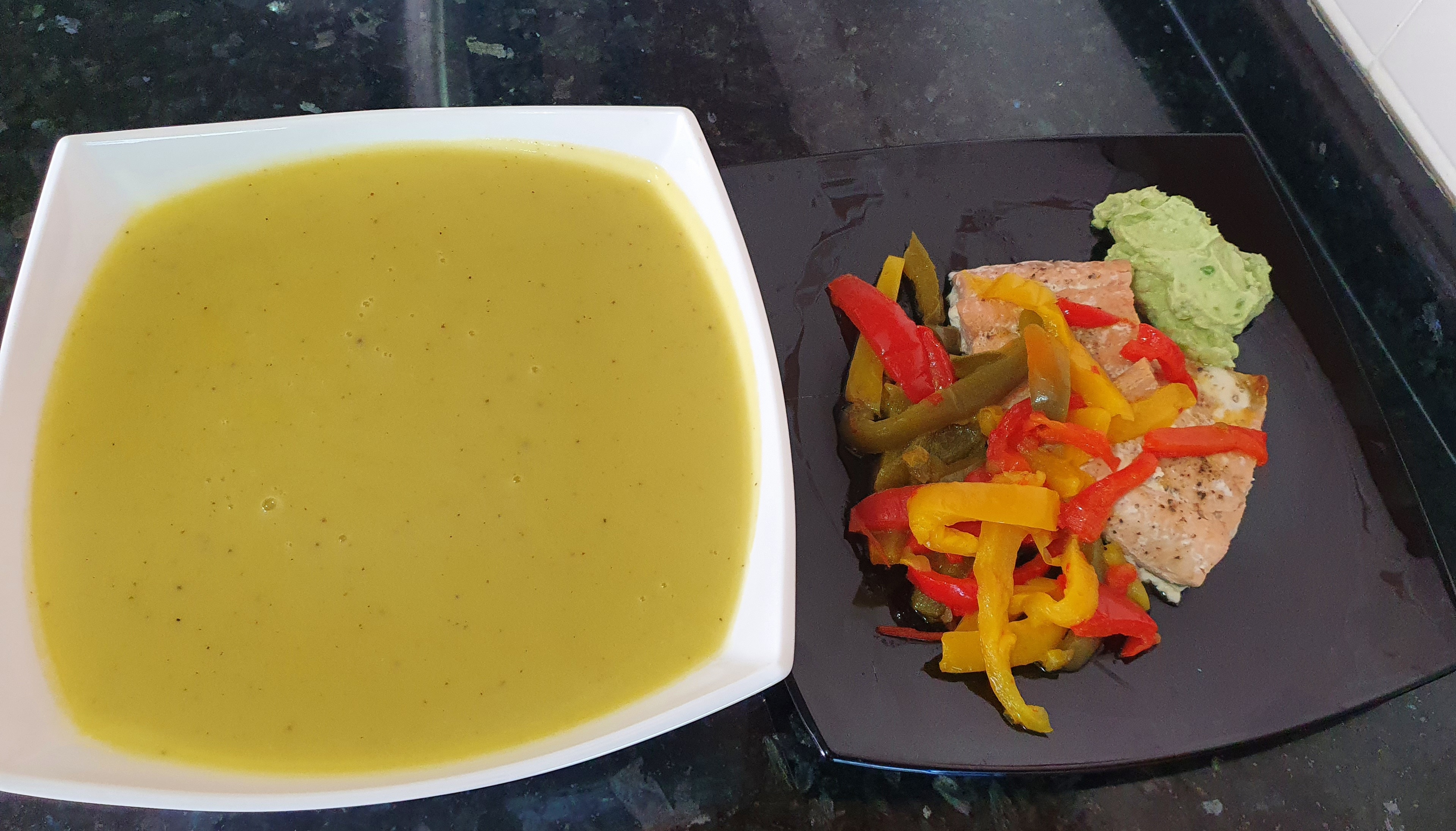 Menú: Patatas guisadas con puerros. Salmón con tres pimientos y salsa de aguacate
