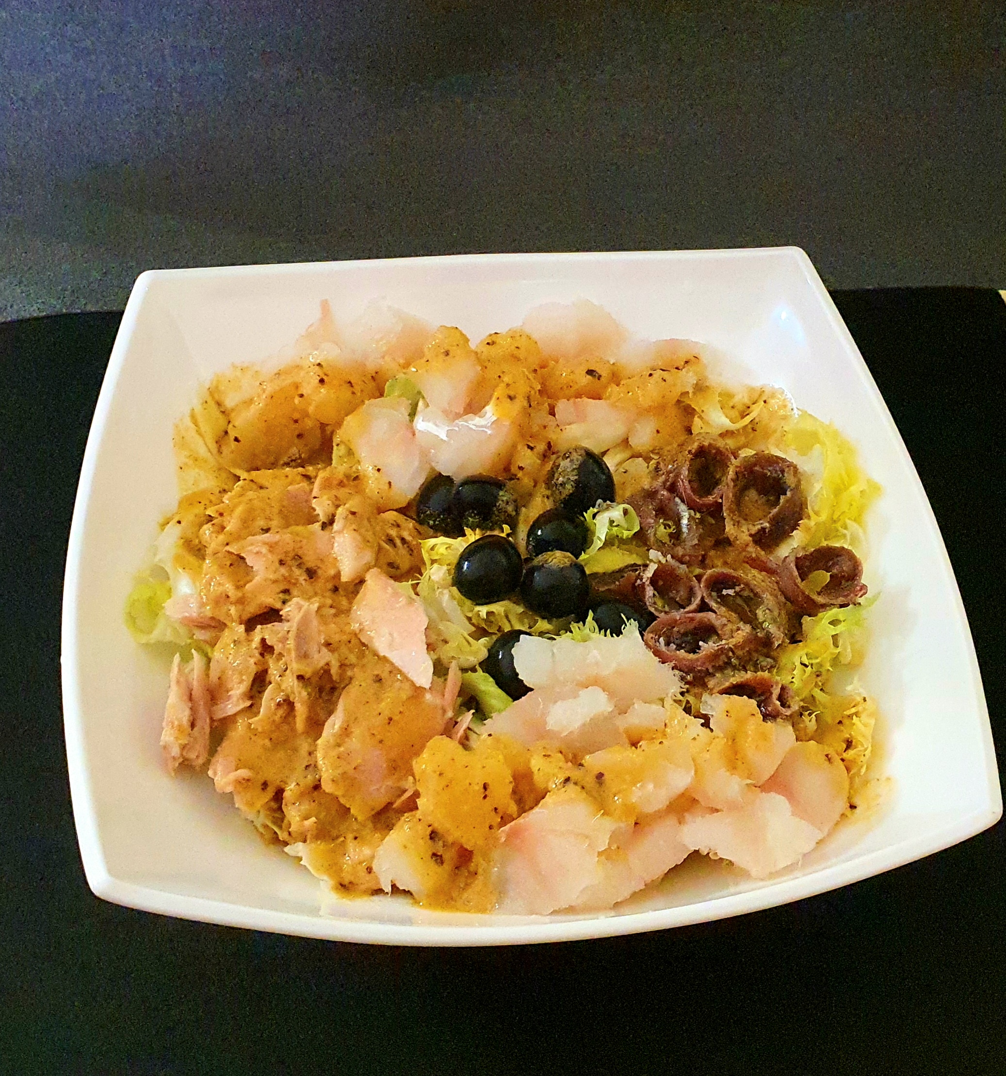 Coloque en una ensaladera las hojas de escarola bien limpias, la cebolleta y el apio, las aceitunas, el atún desmenuzado, el bacalao y las anchoas. Riegue con la salsa reservada y sirva.