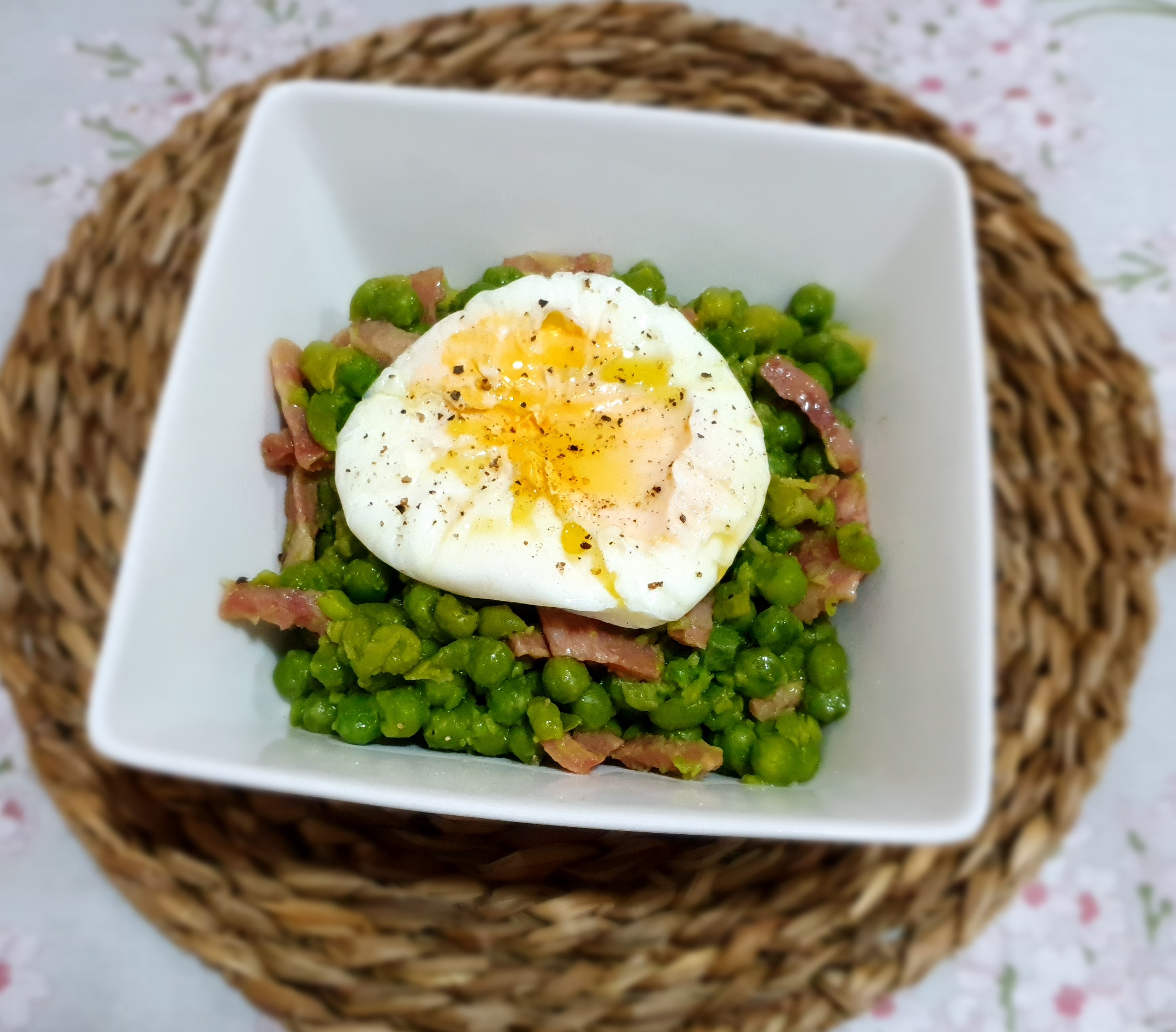 Vierta los guisantes en 4 cazuelas de barro o cerámica. Quite el film de los huevos y coloque sobre los guisantes, espolvoree con sal y pimienta y sirva inmediatamente.