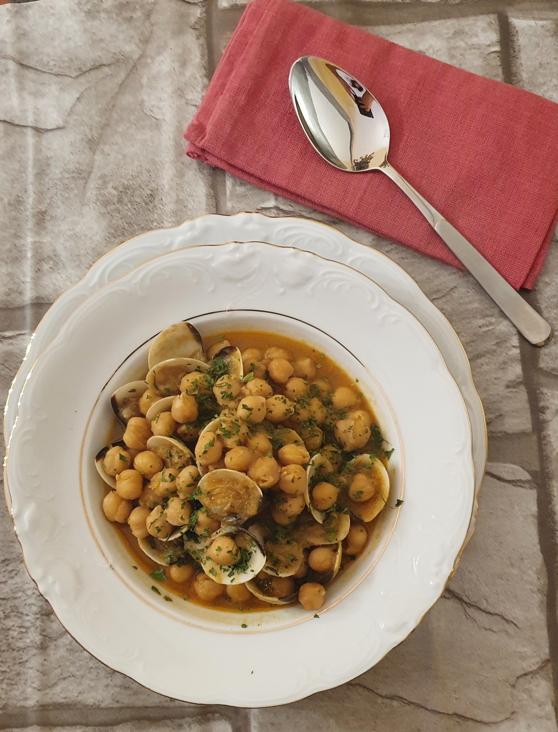 Incorpore al vaso 180 g de garbanzos, introduzca el cestillo con las almejas y programe 8 min/Varoma/giro inverso/vel 1. Con la muesca de la espátula, extraiga el cestillo.