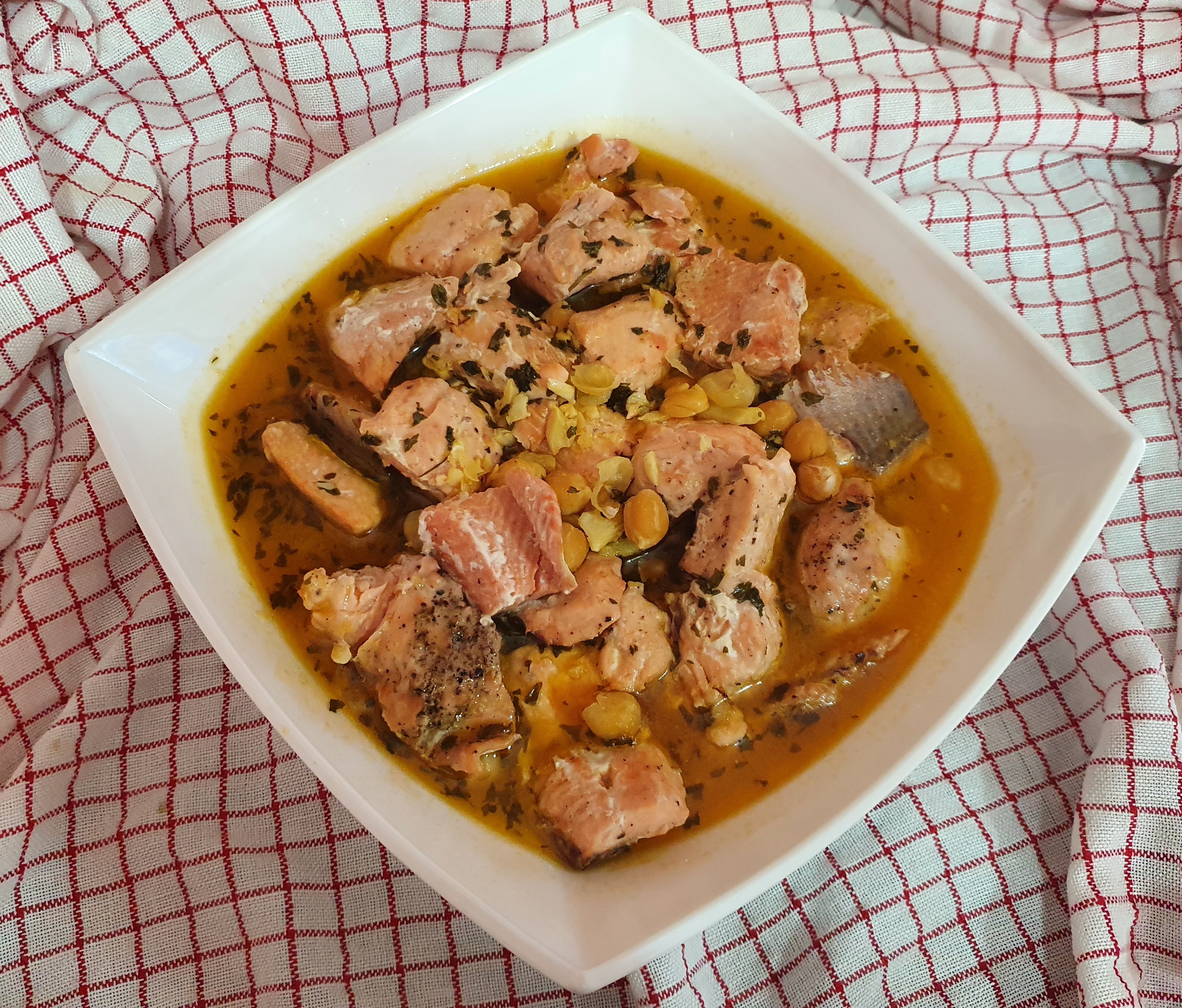 Añada el caldo y 30 g de garbanzos. Introduzca el cestillo con el resto de los garbanzos. Situé el Varoma en su posición y programe 14 min/Varoma/vel 2. Retire el Varoma y coloque el salmón en una fuente honda. Con la muesca de la espátula, extraiga el cestillo y añada al vaso el perejil picado. Ponga los garbanzos con los dados de salmón y vierta la salsa del vaso sobre ellos. Sirva inmediatamente.