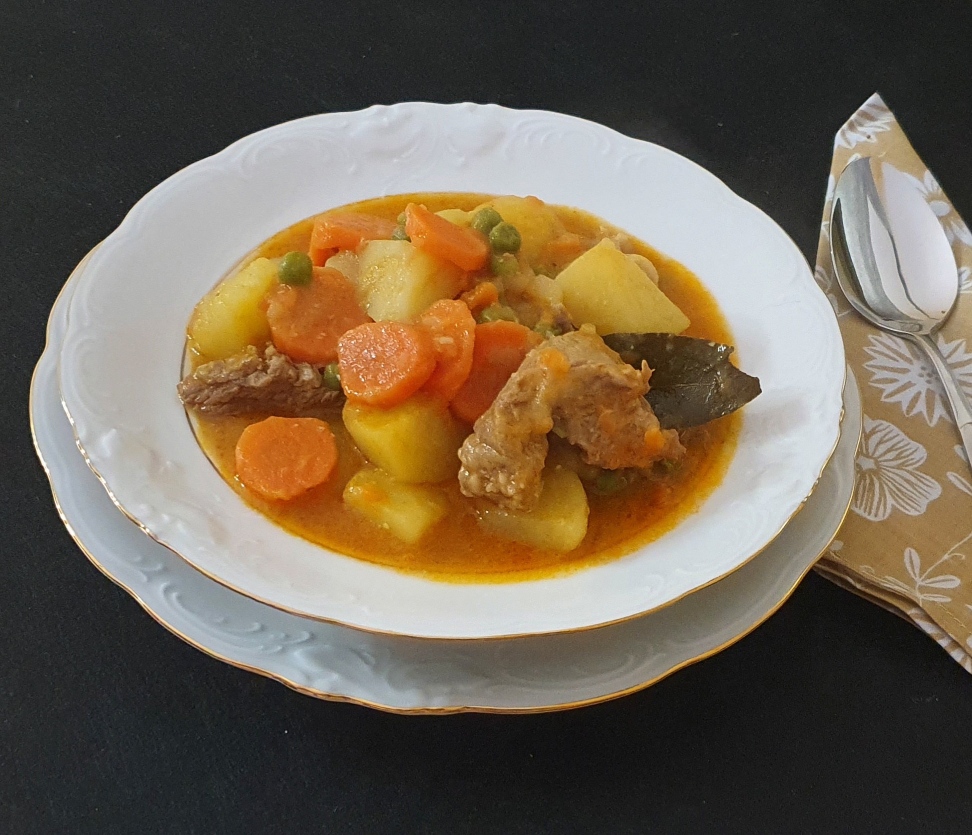 Incorpore el vino, el agua y la pastilla de caldo. Sitúe el recipiente Varoma en su posición con las patatas y las zanahorias. Tape el Varoma y programe 40 min/Varoma/giro inverso/vel cuchara. Retire el Varoma y ponga las patatas y las zanahorias en una sopera. Añada los guisantes y el contenido del vaso, mezcle con la espátula y sirva inmediatamente.