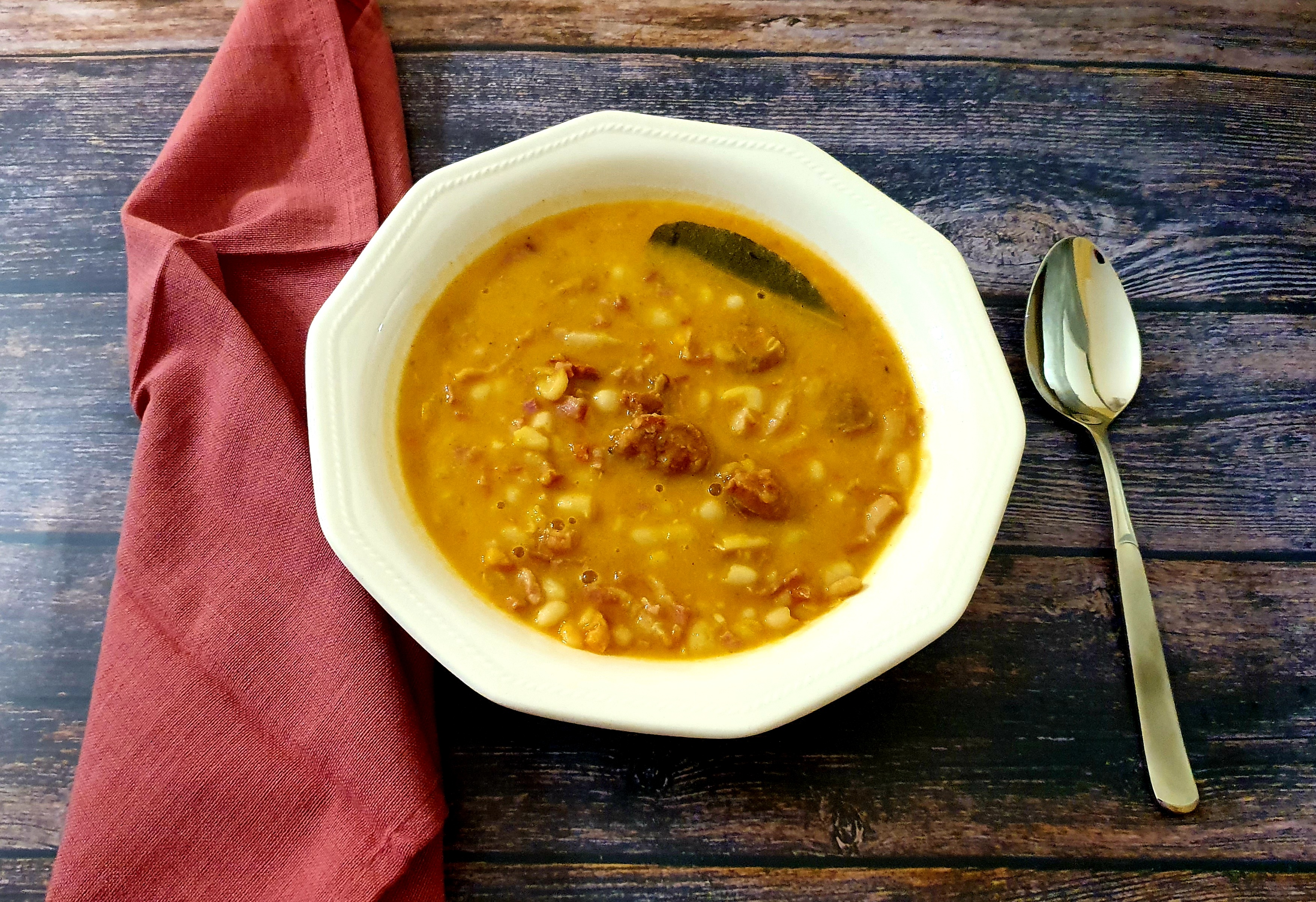 Incorpore el chorizo, el tocino, el jamón, 60 g de las judías reservadas, el caldo, el laurel y la sal. Programe 20 min/Varoma/giro inverso/vel cuchara.
