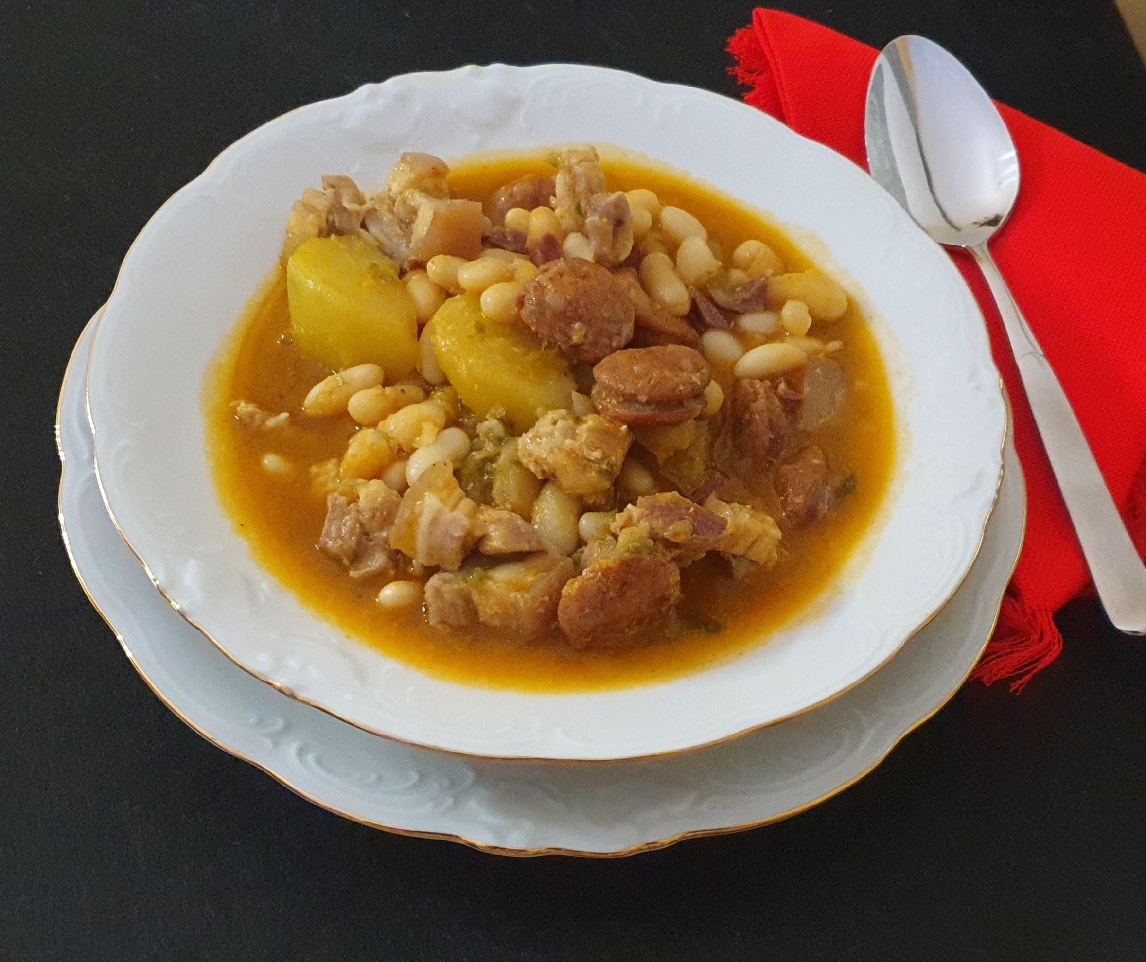 Añada la oreja, el jamón, el chorizo y la patata y rehogue 3 min/120°C/giro inverso/vel cuchara.