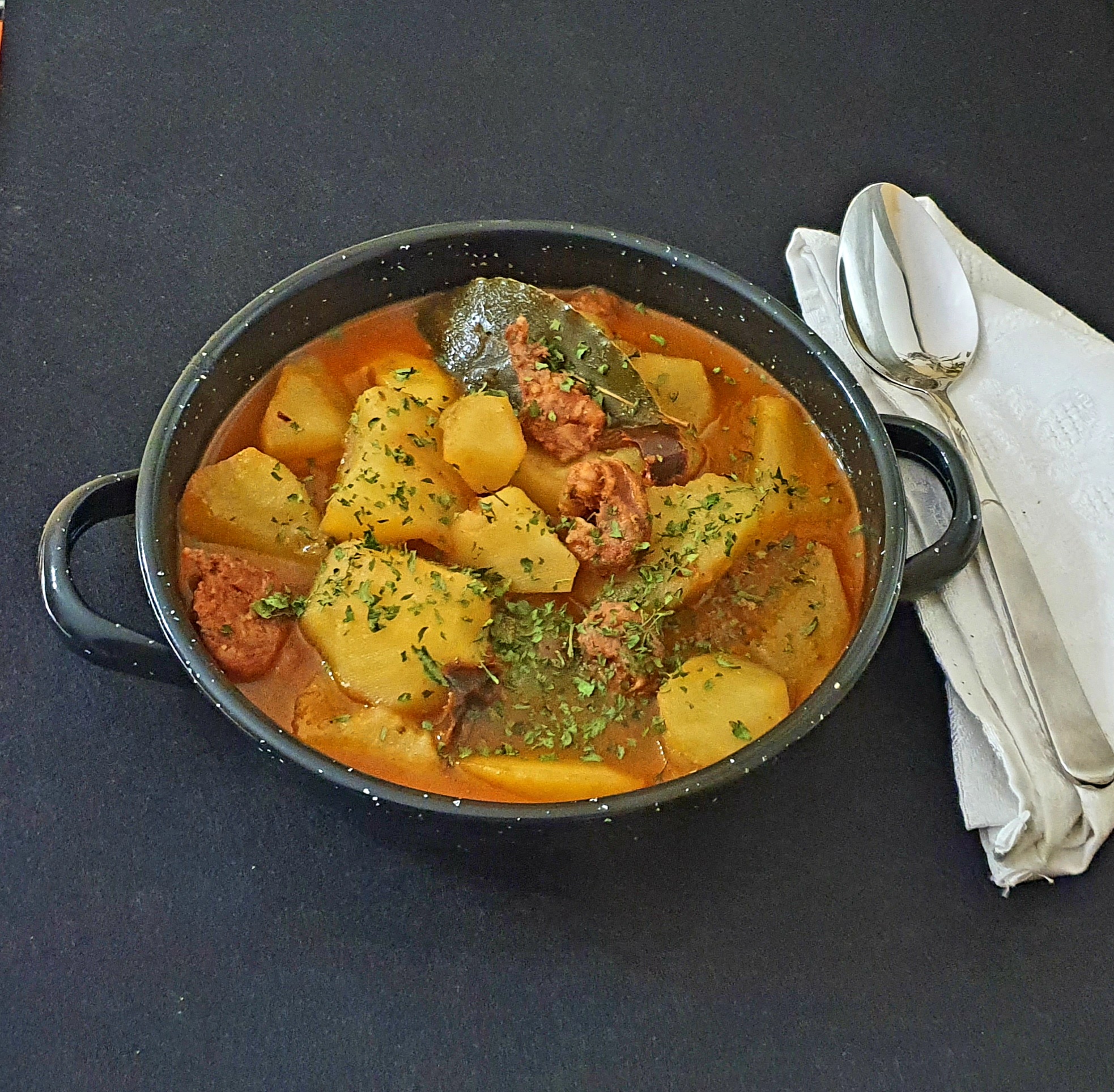 Quite las semillas y el pedúnculo al pimiento choricero, corte en trozos y añádalo al vaso junto con el agua de remojo, el laurel y el caldo. Programe 20 min/100°C/giro inverso/vel 1 y, en lugar del cubilete, ponga el cestillo sobre la tapa para facilitar la evaporación evitando salpicaduras. Vierta las patatas en una fuente de barro, espolvoree con el perejil picado y sirva.