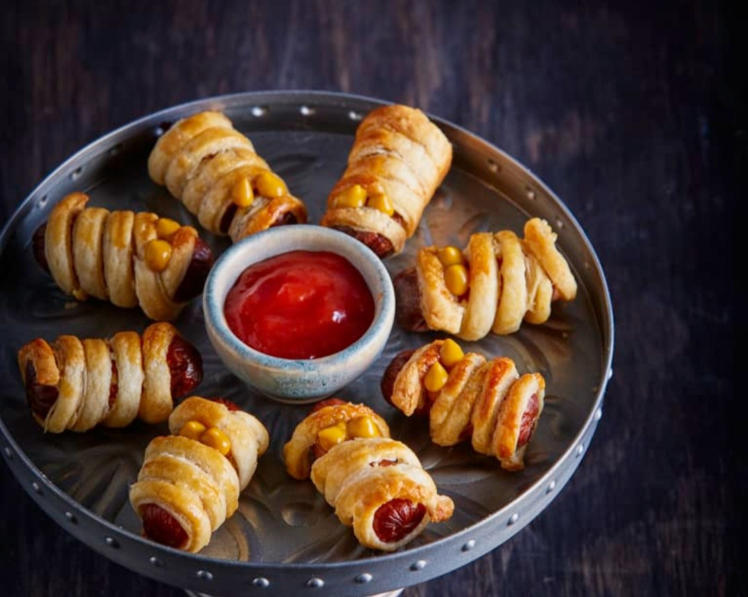 Seque las salchichas con papel de cocina y envuelva cada una en una tira de masa, solapando las tiras ligeramente (para que se asemejen a un vendaje) y dejando libre un espacio donde colocar los ojos. Colóquelas en la bandeja preparada.
