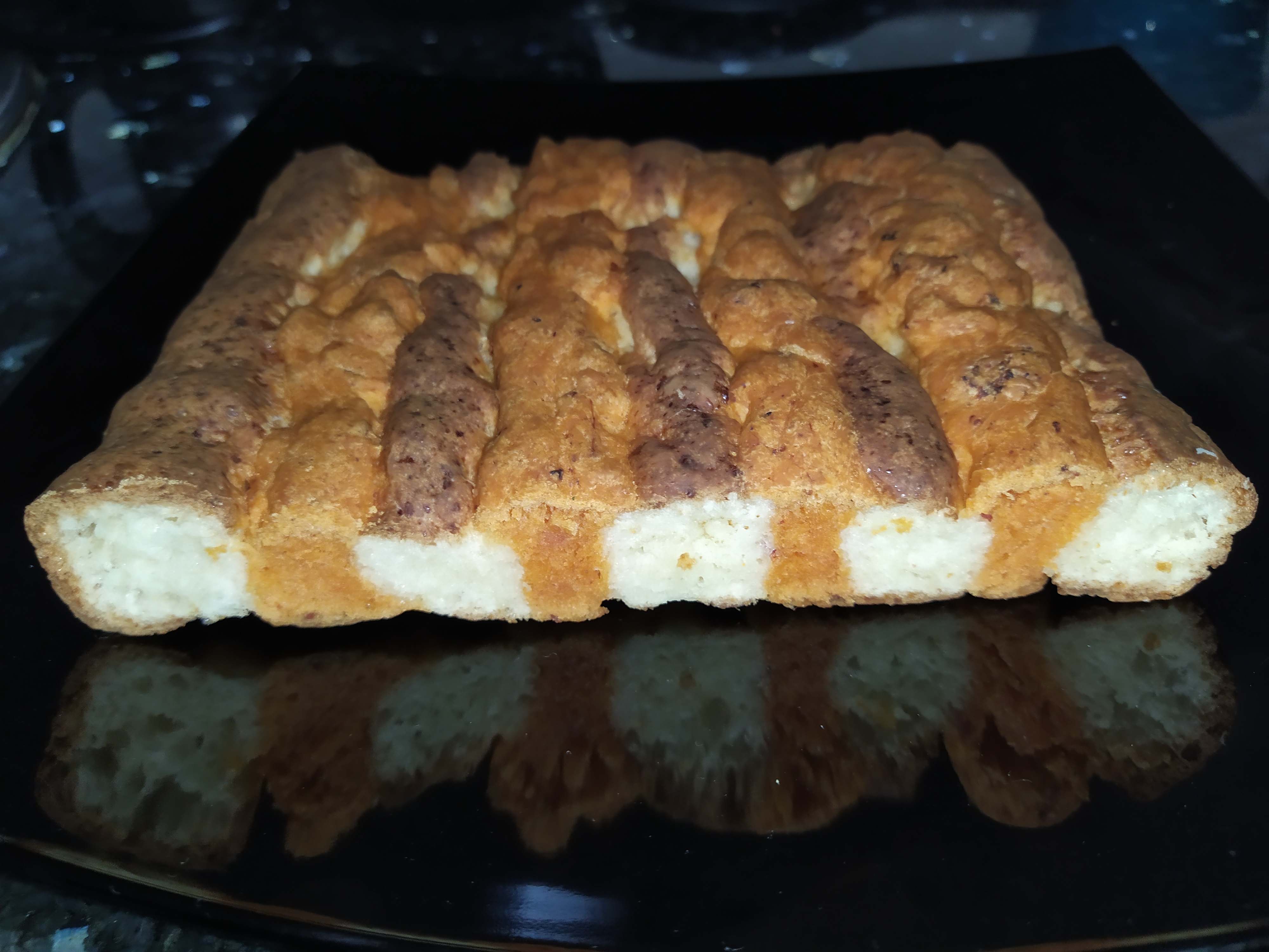 • Una vez formadas las tiras colóquelas en una bandeja de horno y ponga una tira de queso y una de sobrasada intercaladas formando la bandera catalana.