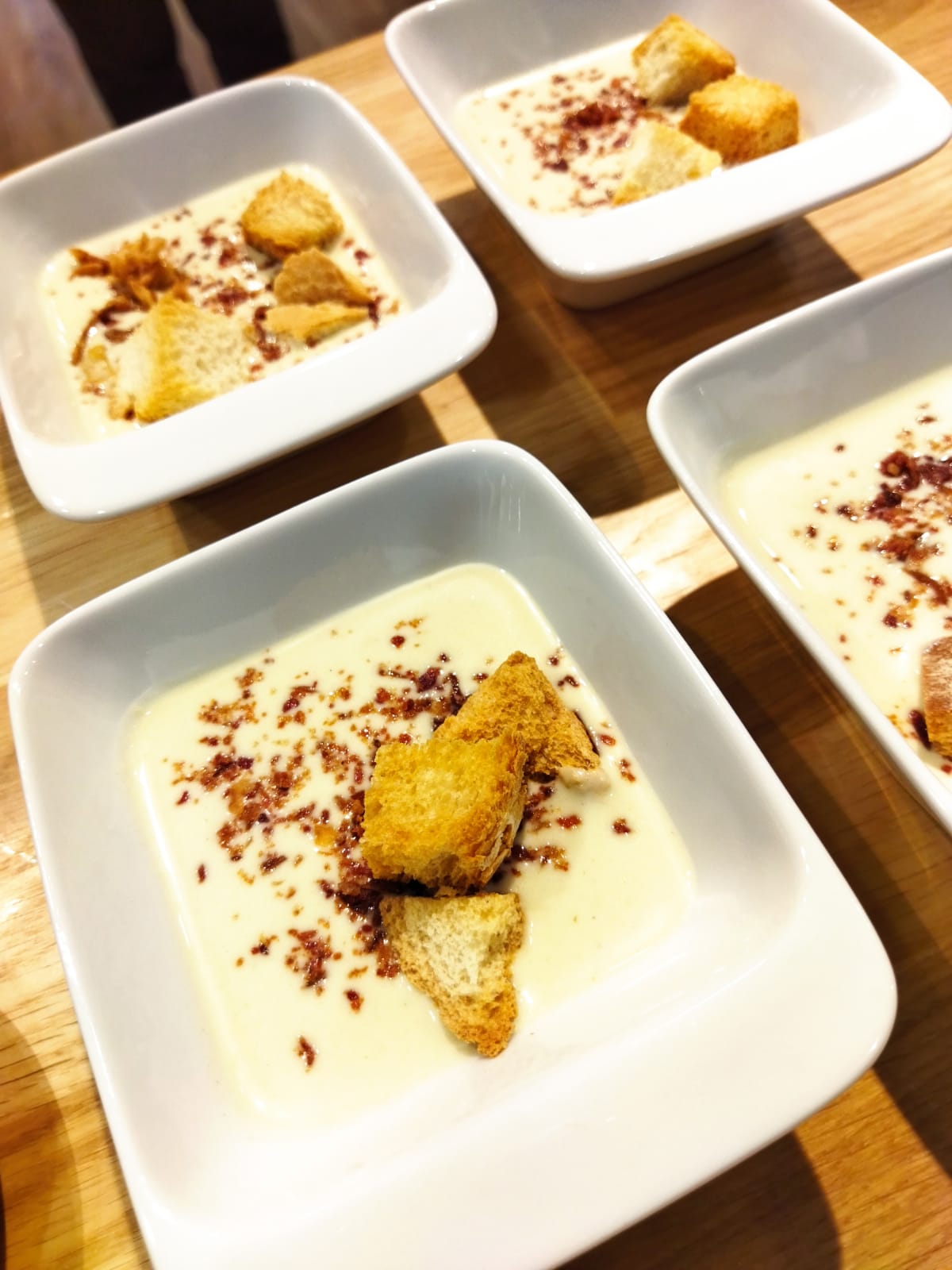 Vierte la crema en vasitos y decora con taquitos de jamón, cebolla frita o picatostes.