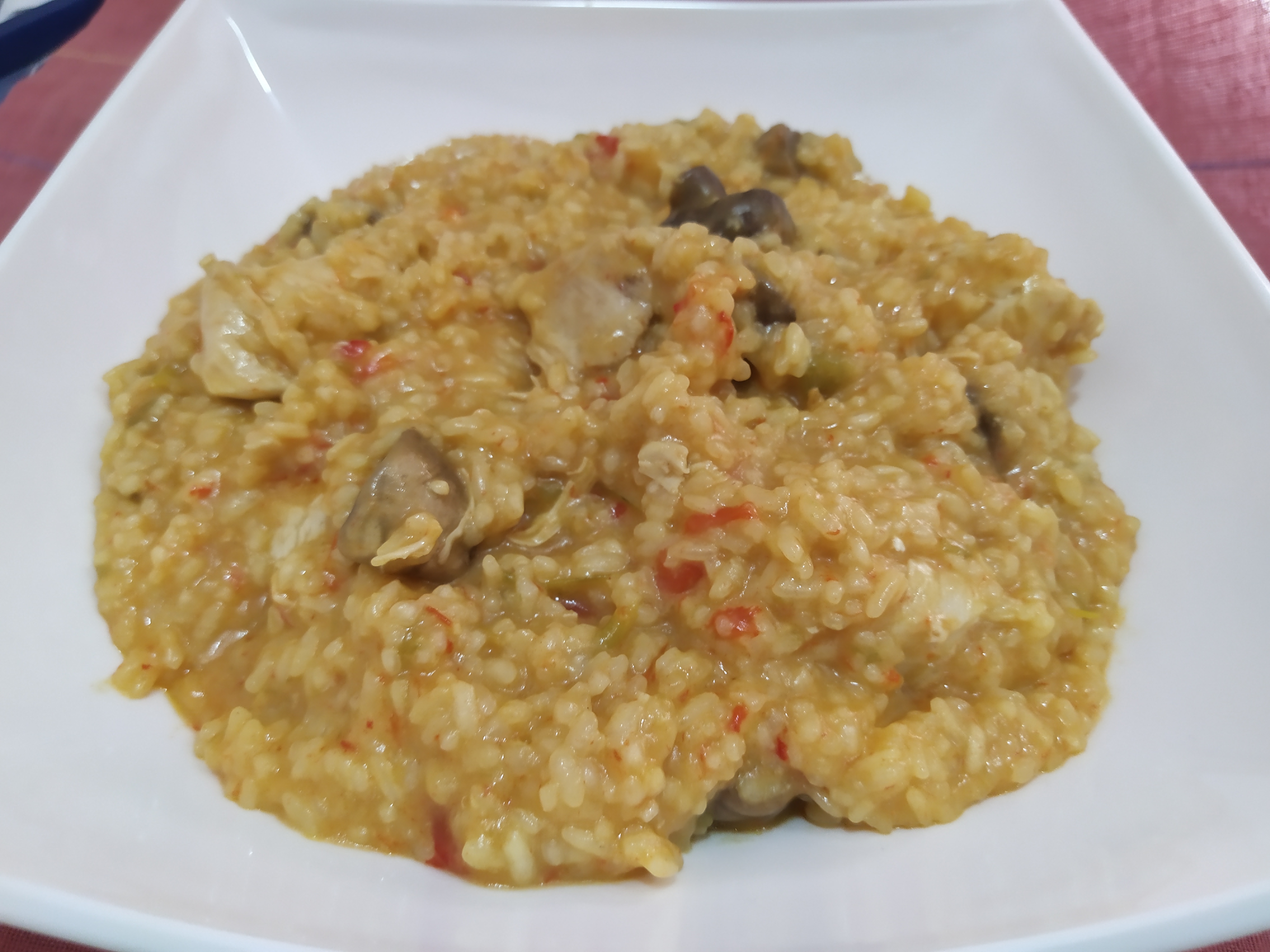 Agregue el pollo, el caldo, el pimentón, el colorante amarillo y la sal. Programe 9 min/Varoma/giro inverso/vel cuchara.