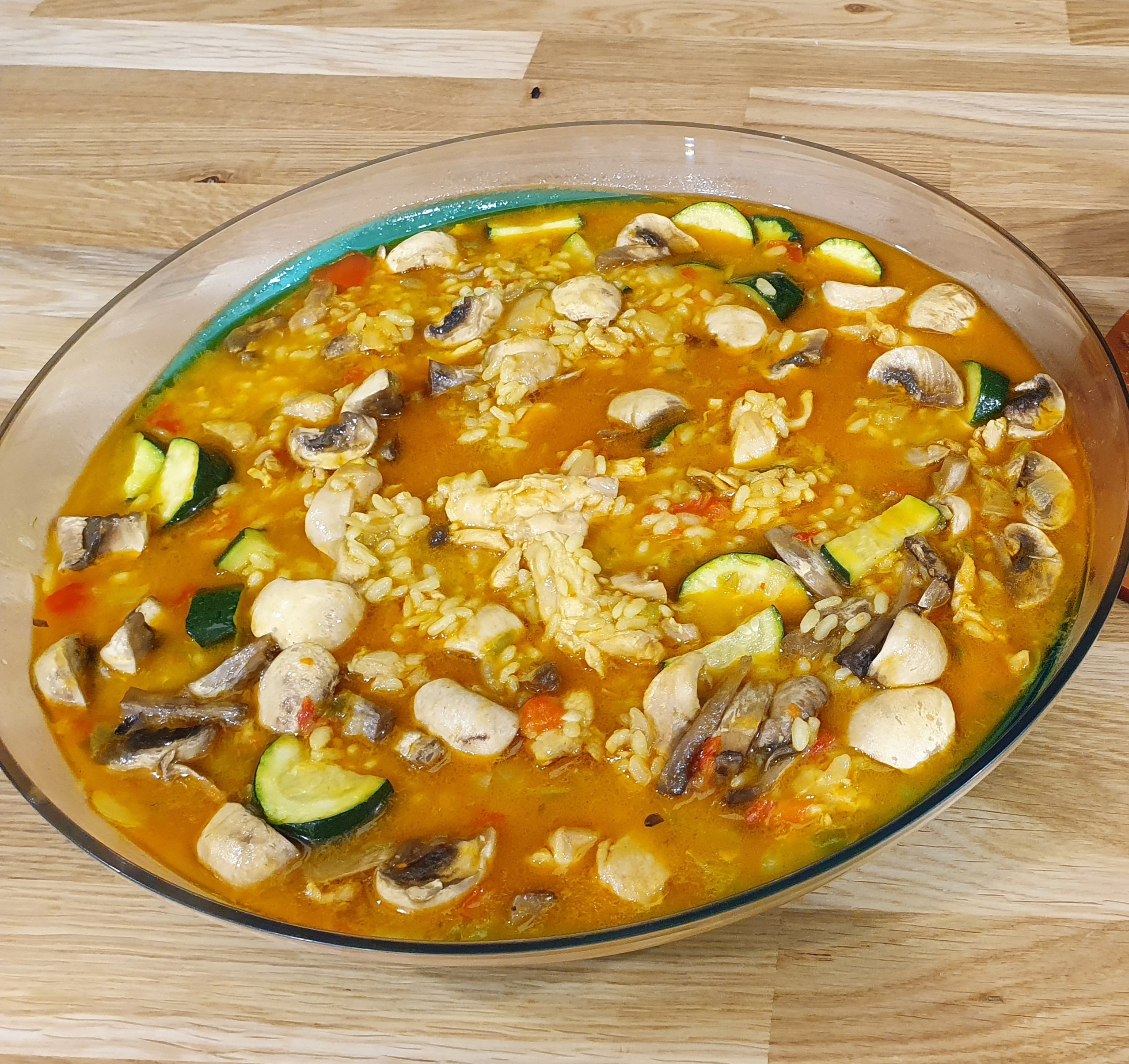 Agregue el arroz, la pastilla de caldo, el pimentón, la sal, el colorante y el agua. Sitúe el recipiente Varoma en su posición con el calabacín y los champiñones. Tape el Varoma y programe 15 min/Varoma/giro inverso/vel cuchara. Retire el Varoma y ponga las verduras en una fuente. Vierta el arroz y mezcle delicadamente con la espátula. Deje reposar 5 minutos antes de servir.