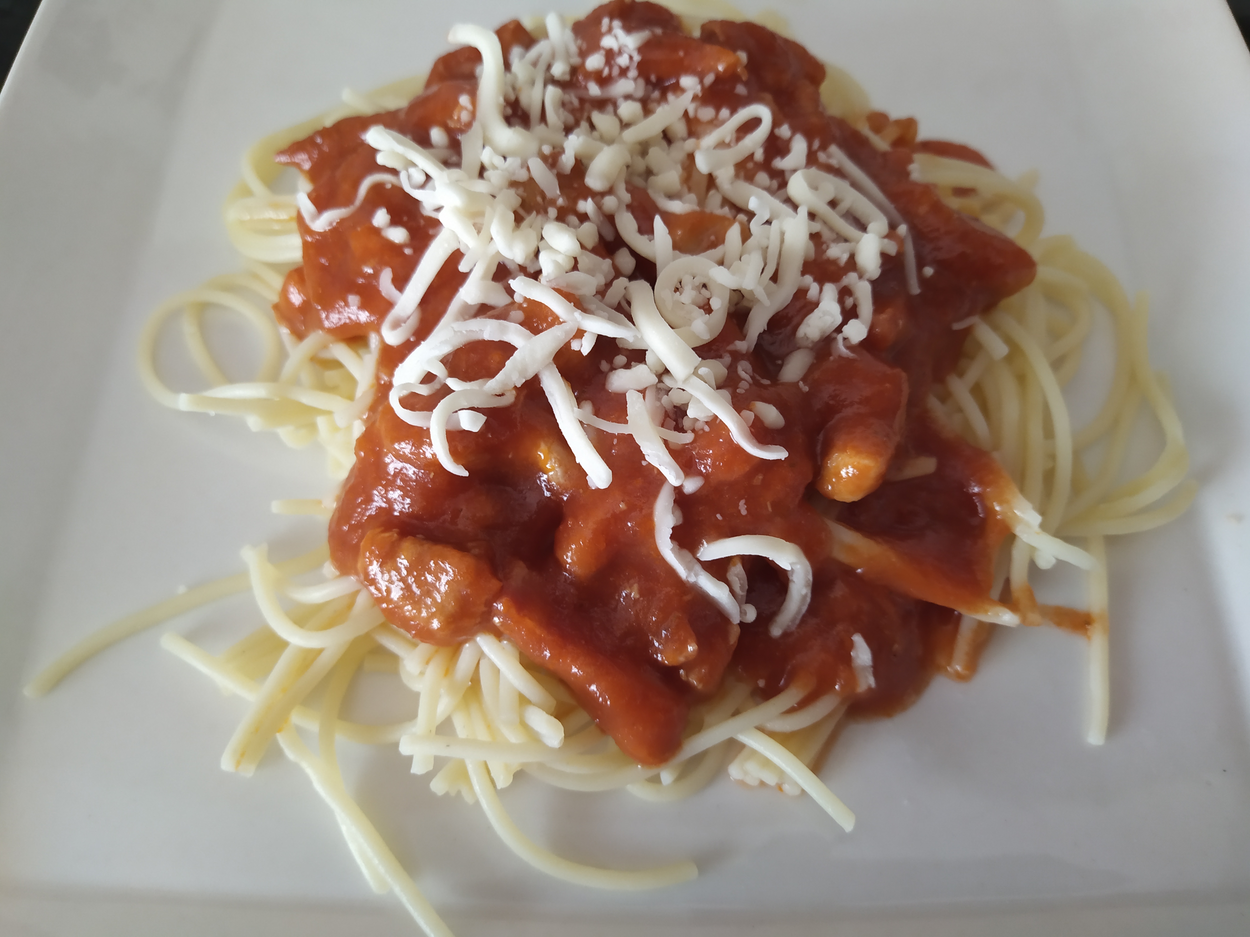 Añada el tomate, el chile, la sal y la pimienta y programe 15 min/100°C//vel 1. Mientras tanto, cueza los espaguetis en abundante agua hirviendo con 1 cucharadita de sal durante el tiempo indicado en el paquete o hasta que estén al dente. Escurra la pasta y póngala en la fuente de servir. Vierta la salsa sobre la pasta, espolvoree con el queso rallado y sirva.