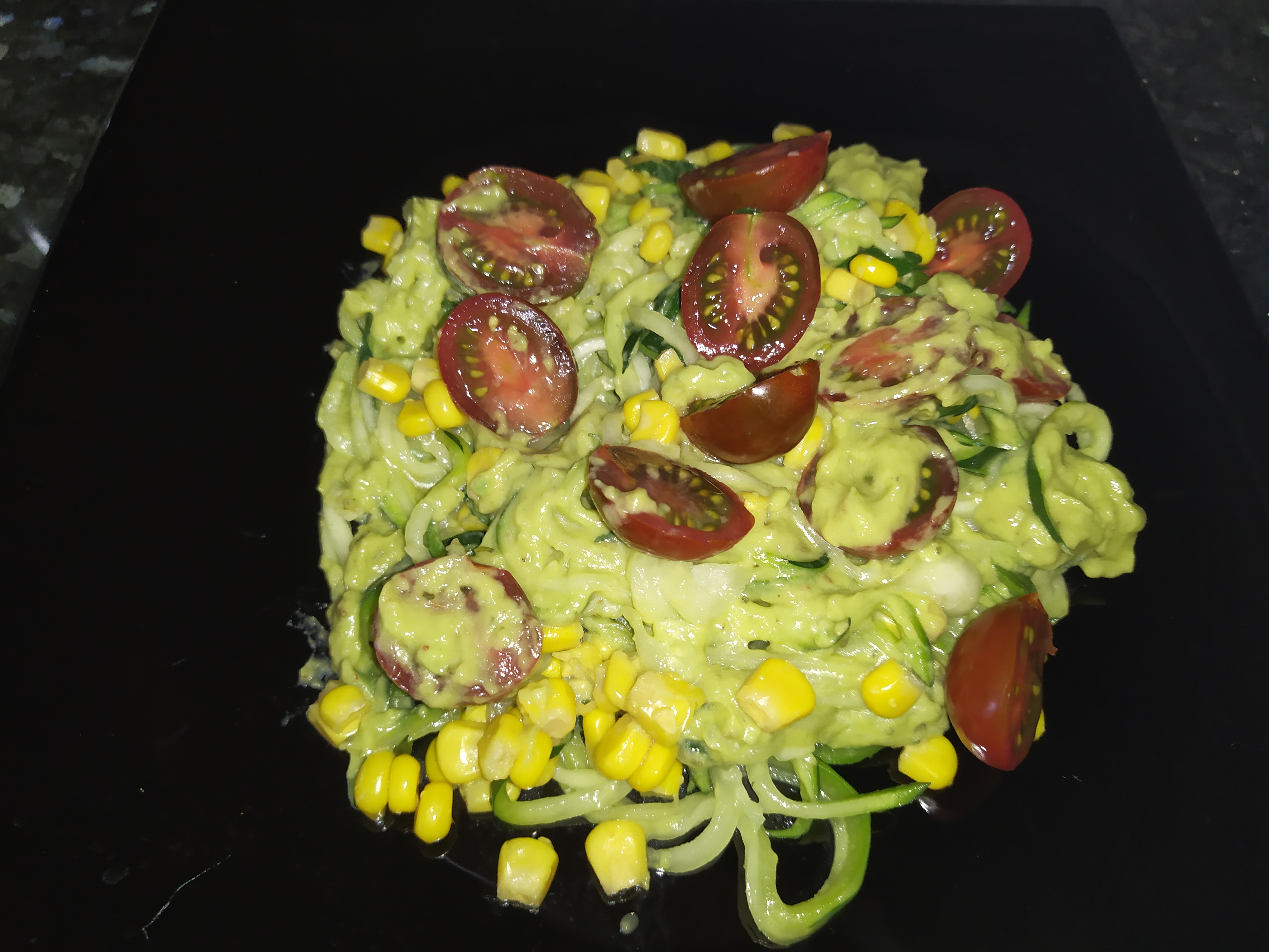 Cuele los espaguetis a través del recipiente Varoma y mezcle con la salsa de aguacate, los tomates cherry y el maíz. Espolvoree con el parmesano rallado y sirva.